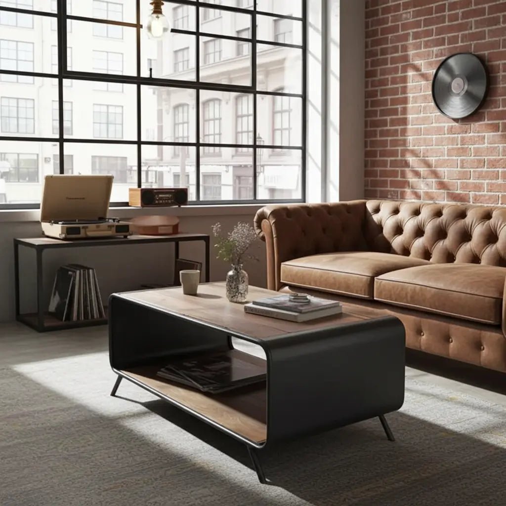 Table basse rétro bois recyclé et acier anthracite