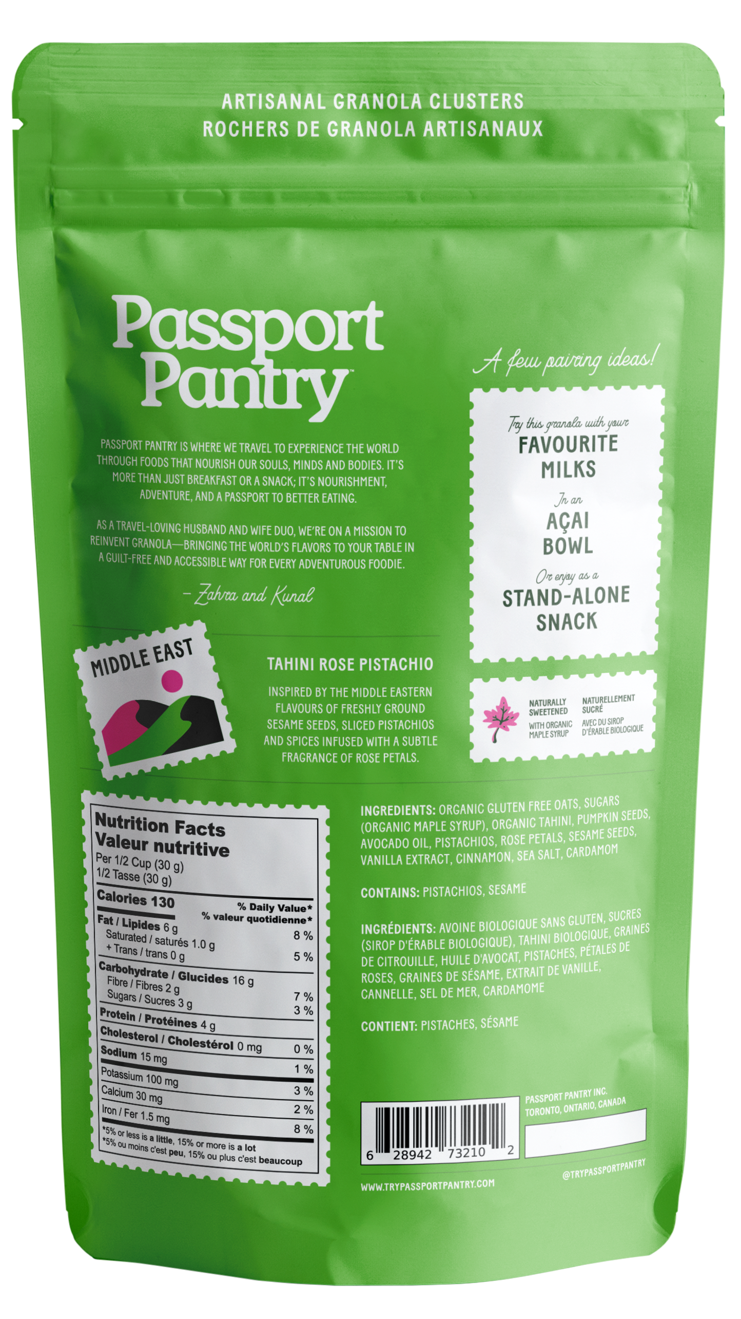 INGREDIENTS: Organic Gluten Free Oats, Sugars (Organic Maple Syrup), Organic Tahini, Pumpkin Seeds, Avocado Oil, Pistachios, Rose Petals, Sesame Seeds, Vanilla Extract, Cinnamon, Sea Salt, Cardamom