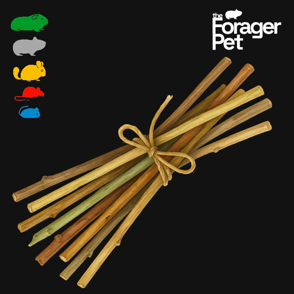 Keep your rodent’s teeth in tip-top shape with this fun and flavourful selection of chewable twigs. Each bundle includes 11 hand-cut sticks from a rotating mix of fruit trees, shrubs, and canes. This variety encourages natural chewing, lets your pet explore different tastes and textures, and keeps them mentally engaged. It's also a great way to learn their preferences—so we can send you their favourites next time!