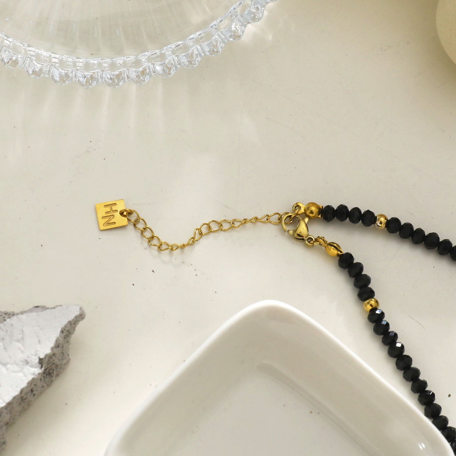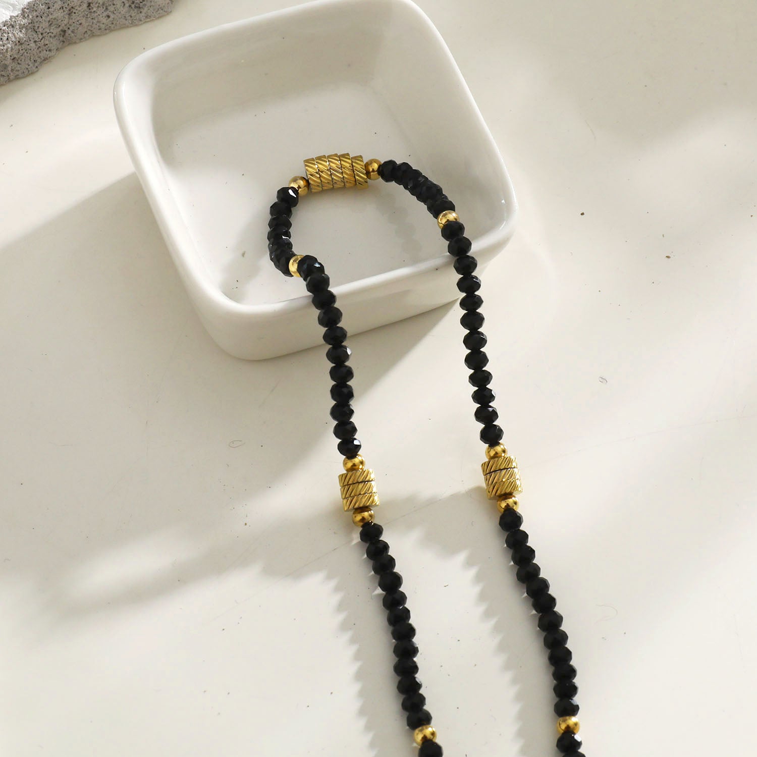 Dainty gold beads punctuate this black crystal necklace, making an exquisite style statement. Solo or layered, add some interest & intrigue to your outfit of the day.