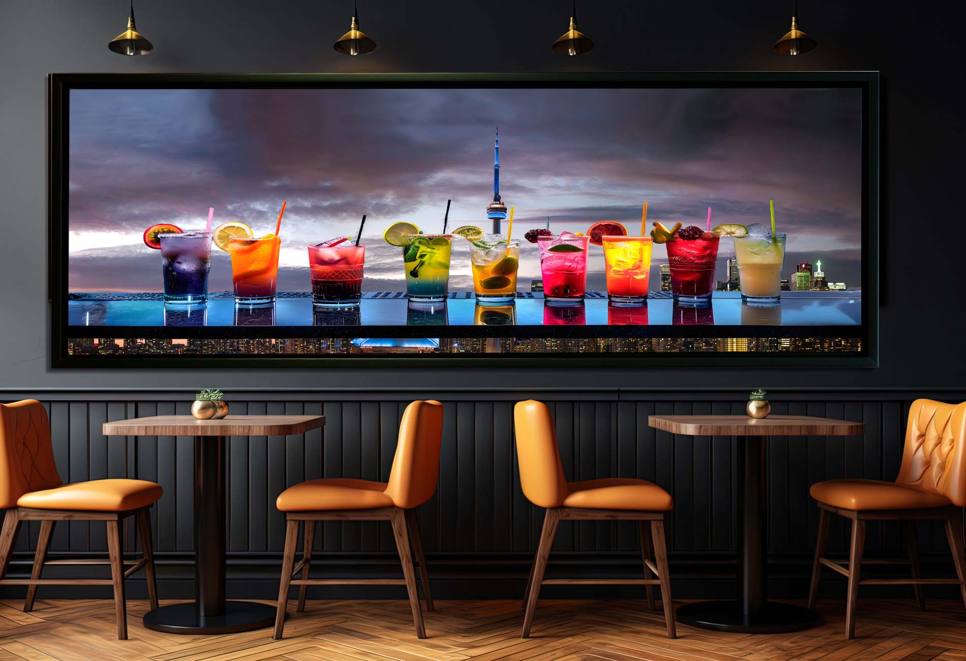 This canvas print showcases an incredible photo of a Toronto sunset. Enjoy a variety of colorful cocktails while admiring the stunning view of the CN tower. Perfect for decorating pubs, restaurants, or your own home, this piece is a unique addition to any space.
