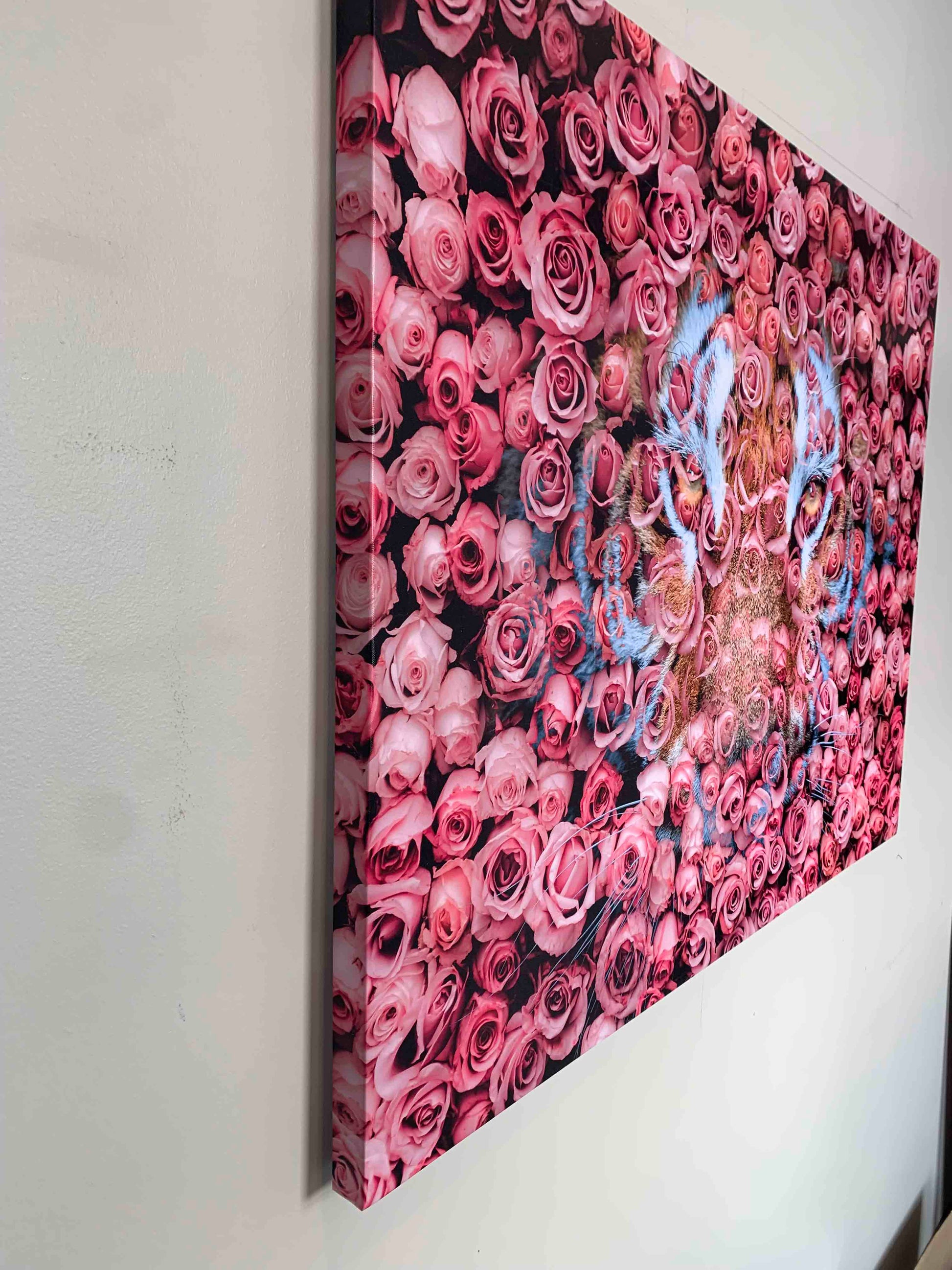 Tiger in the Rose, is a wildlife canvas print measuring 48" wide x 36" high x 1.25" deep with a glossy gold finish, perfect for bringing your walls to life with this spectacular wildlife artwork. This deluxe canvas is truly one of a kind, with a hand-applied gold glaze that wraps the majestic grace of the Tiger in Roses, perfect for adding a touch of sophistication to any home or office!