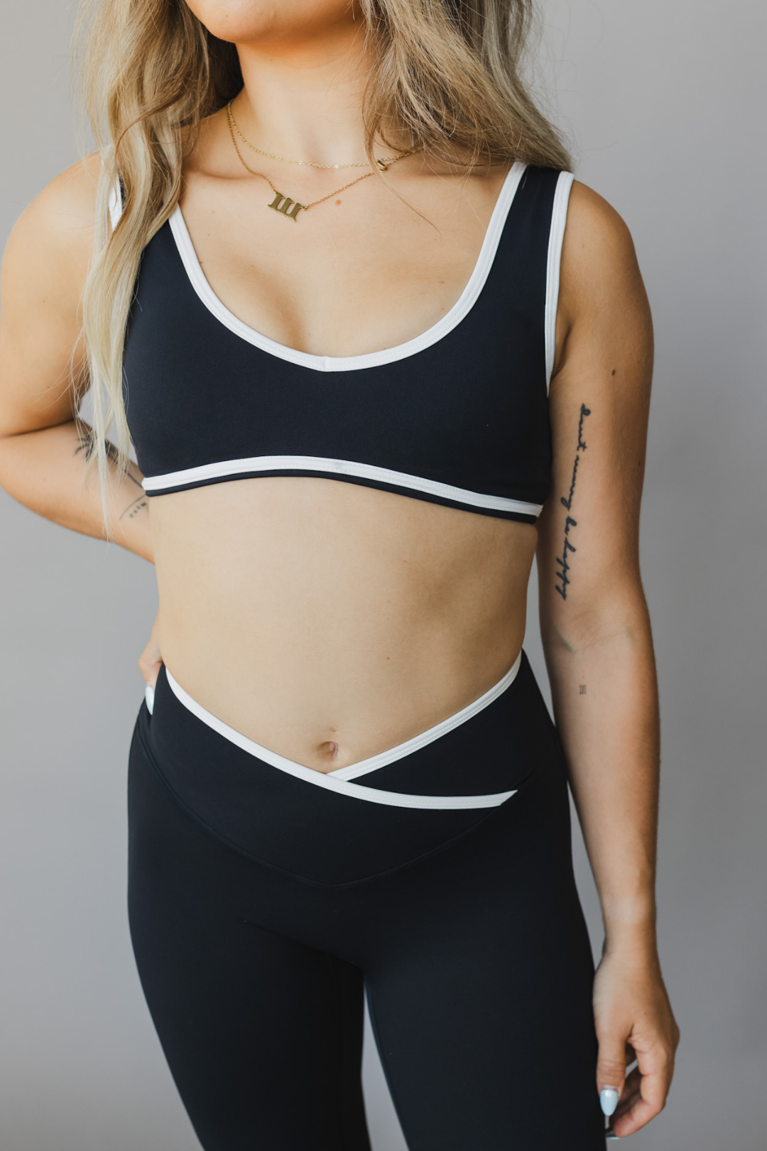 This classic sports bra is reimagined with bold white trim framing and a deep scoop neckline that flatters while offering support. Lightweight yet durable, it pairs perfectly with any bottom thanks to the seamless design and clean silhouette. Wear it solo or layered for a timeless, sporty look.