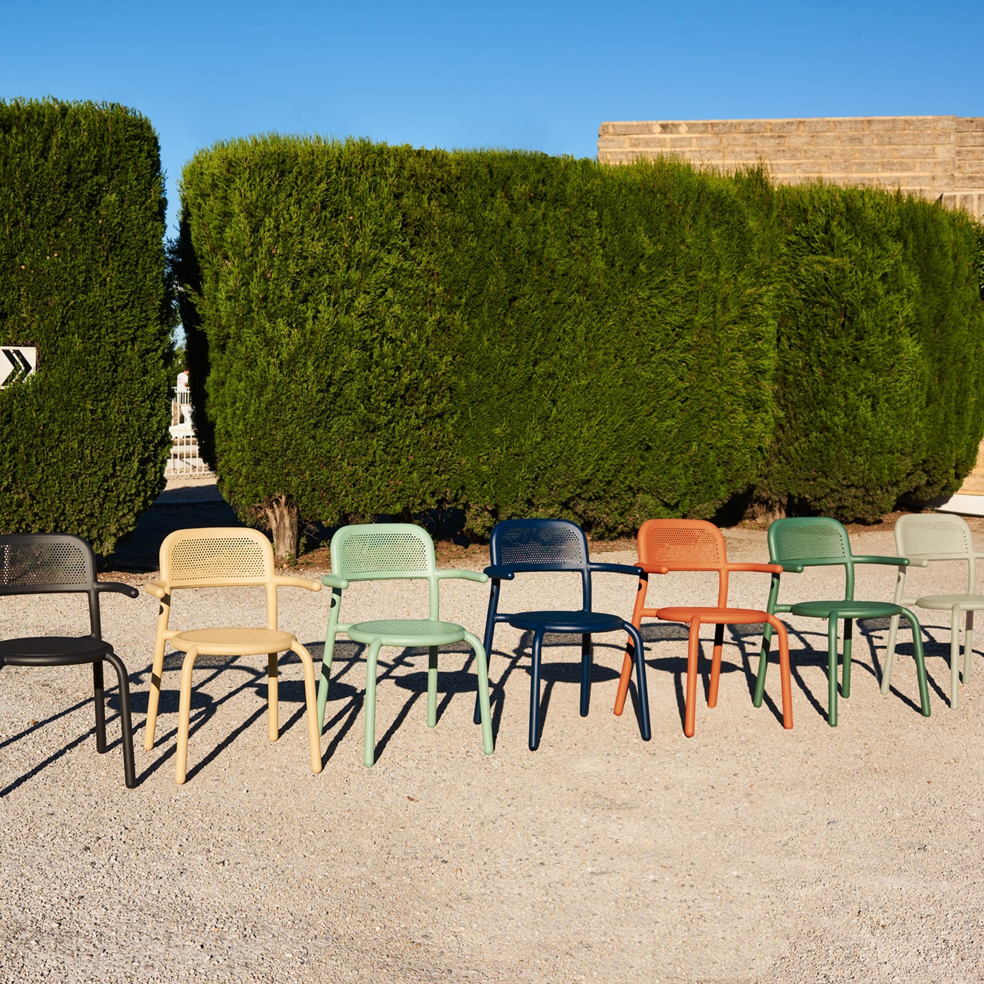 With its smooth, generous lines and robust seat, the Toní Armchair combines a welcoming shape with a sturdy design. The armrests give it a fun, almost cartoonish look. Of course, the Toní's hexagonal pattern in the seat and back is unmistakable. It’s nice and airy to sit on, with a nod to the classic bistro chair. Feel free to lift the Toní Armchair and discover how light it is. It comes in handy, as you can easily stack up to four chairs.