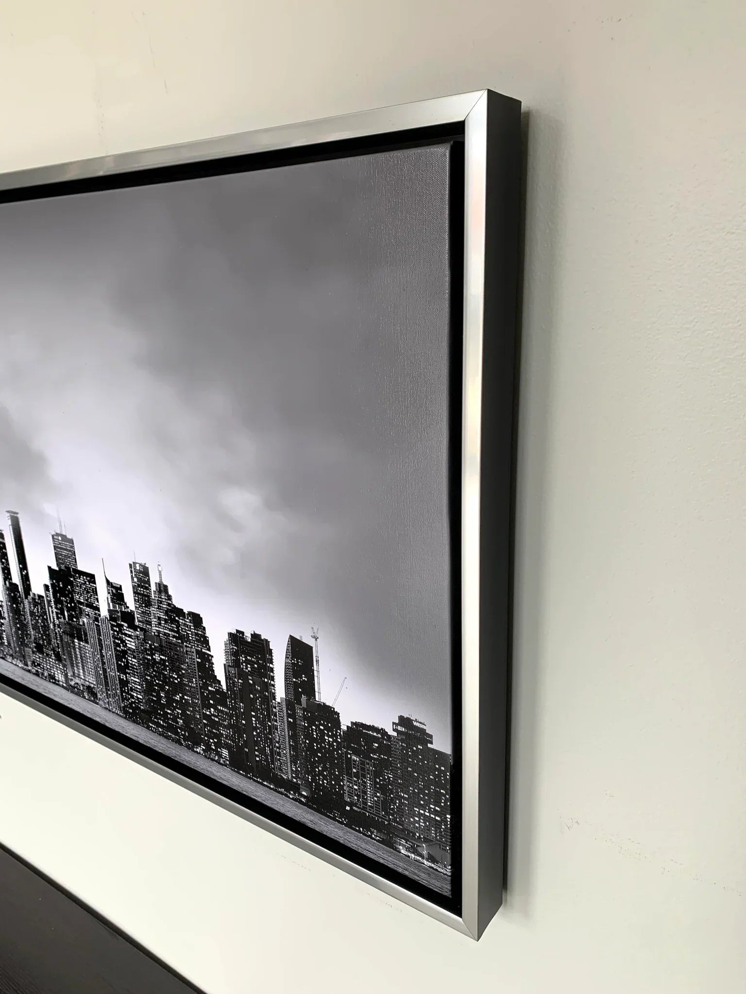 Toronto in Black and White is a high-resolution, large-format canvas print that captures the beauty of Toronto's majestic skyline, focusing on a perspective of the CN Tower, other iconic buildings and Lake Ontario, framed under a dramatic sky of contrasting light and dark. Measuring 72" x 24", this piece of art will make a statement in any room. Art prints Toronto