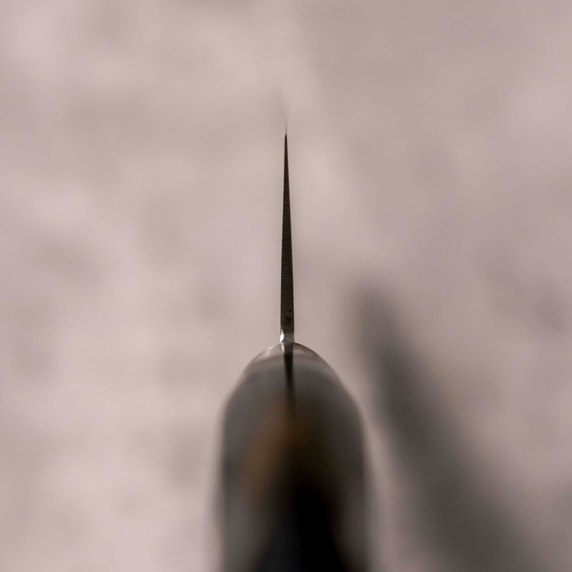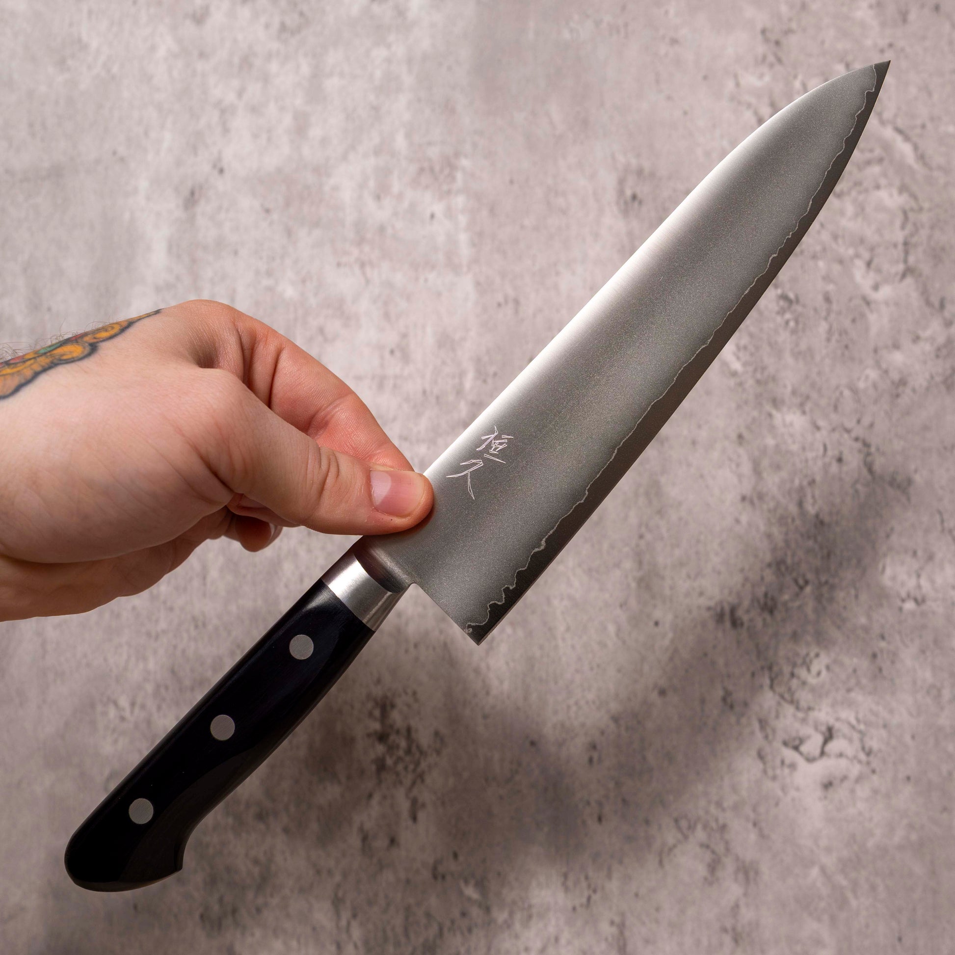 This is a fantastic starter Gyuto for the home cook or professional chef looking for an easy to maintain, high performing and good looking chefs knife. The VG-10 steel won't rust or discolour even if it's not wiped down immediately after use and it has very good edge retention. The wavy damascus pattern blends beautifully with the tsuchime "hand hammered" finish and is further complemented by the brown pakka wood handle. The triple riveted handle ensures this knife will stand up to the toughest kitchen conditions and is comfortable to grip.