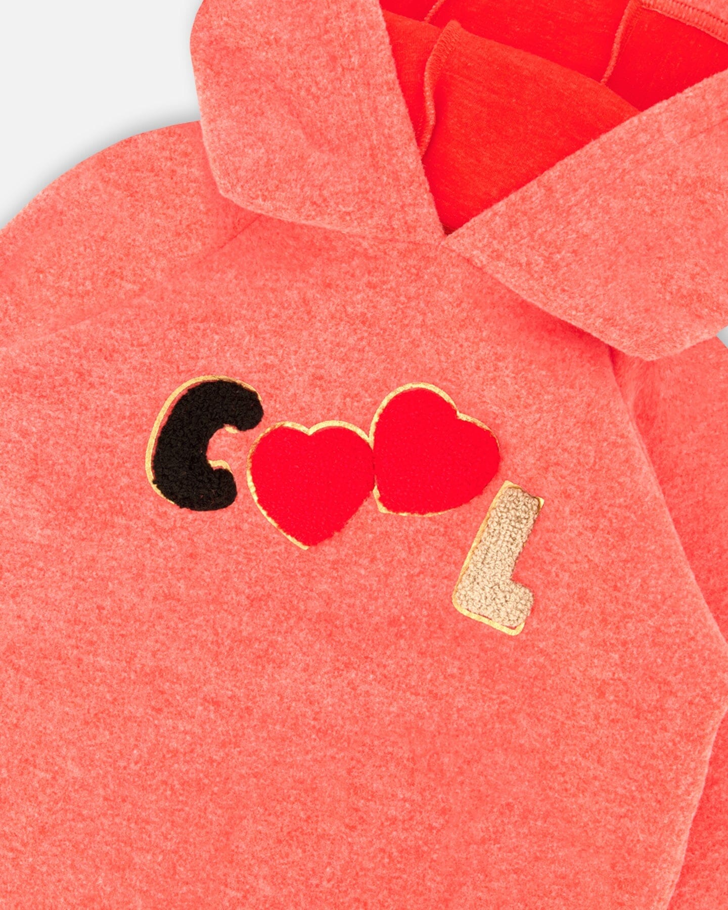 This Hooded Tunic Coral is the perfect blend of cozy and cool for her wardrobe. Made from a soft blend of cotton, polyester, and elastane, this brushed fleece long top ensures warmth and comfort all day long. Featuring the word “COOL” in bold appliqué on the chest, with heart-shaped “O”s, the tunic has a touch of sparkle with shiny gold contouring around each letter. The hood adds extra warmth and style, while the long sleeves keep her cozy during cooler days. It's the perfect piece to pair with leggings or skirts for a stylish, laid-back look.