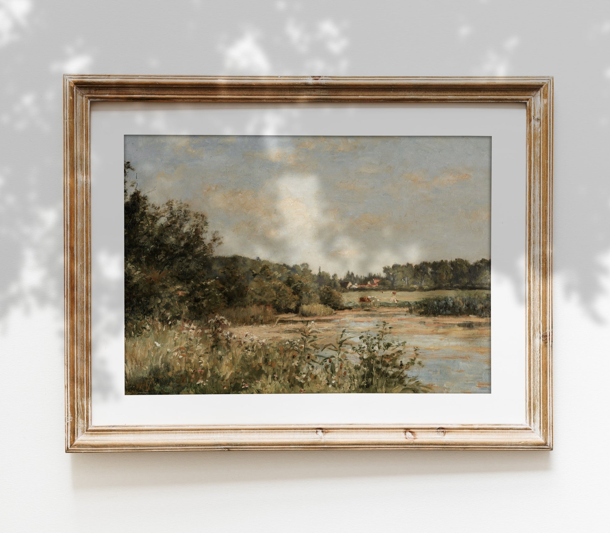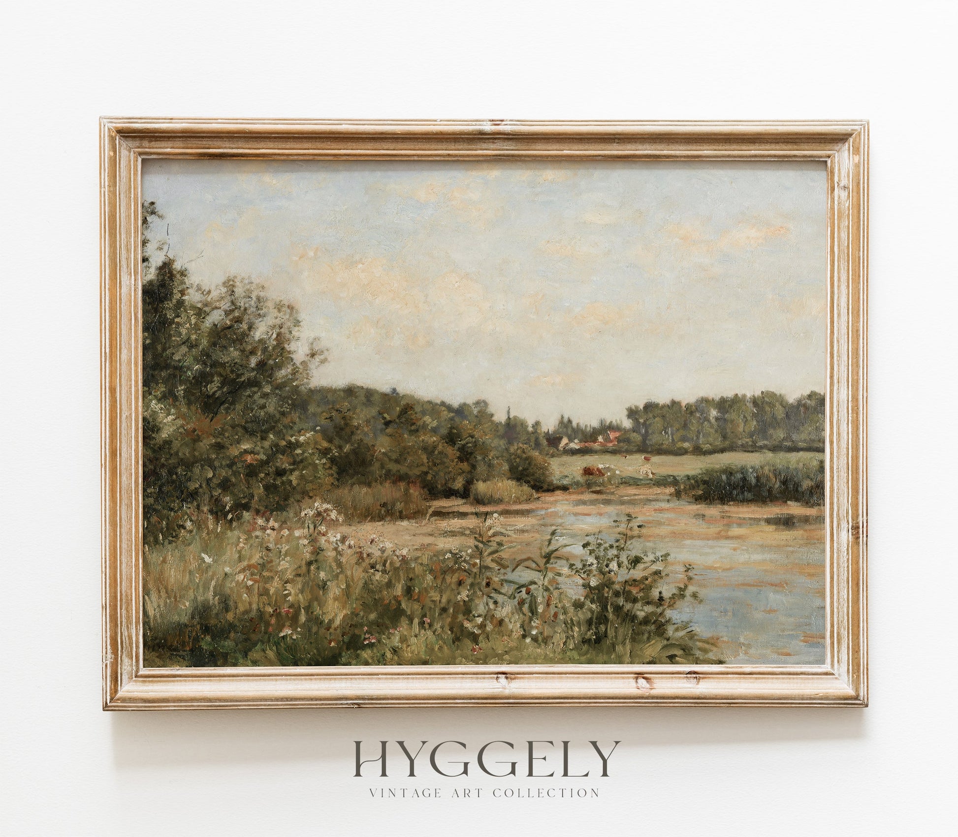 Hyggely Vintage Art Print Collection - Antique Oil Painting of Muted Green Farmland and Stream