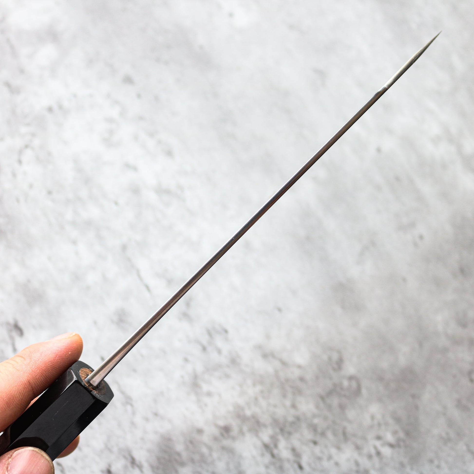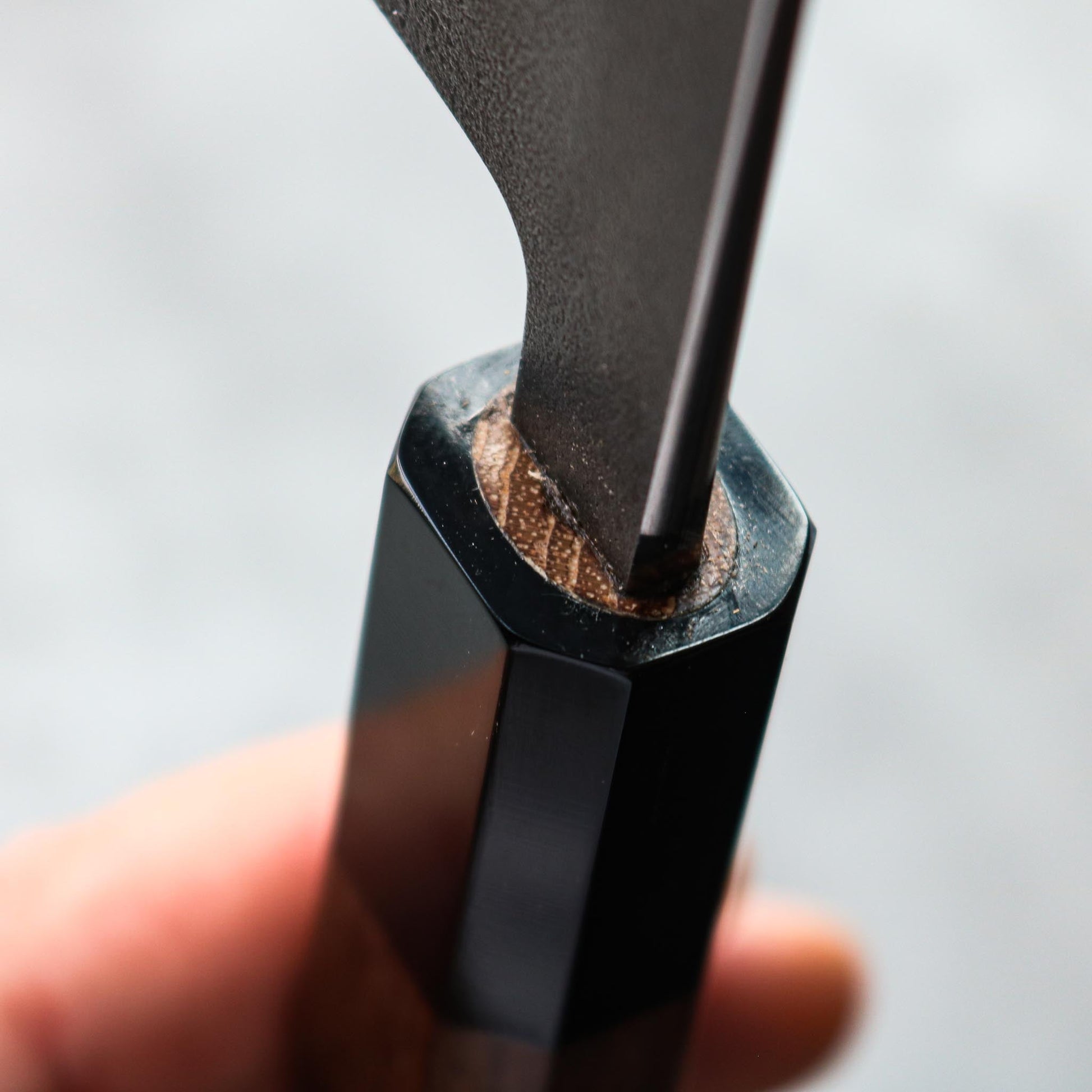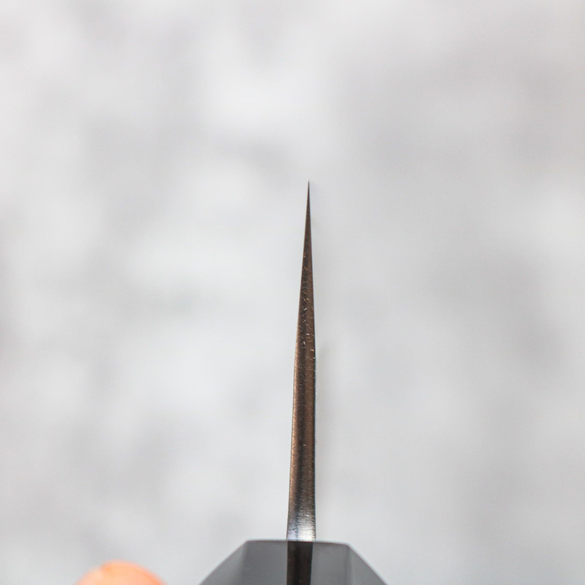 The distal taper on Yoshikane Hamono knives are characteristic of Tsubame-Sanjo city region, Niigara Prefecture knives, coming thick out of the handle, and thin at the tip.