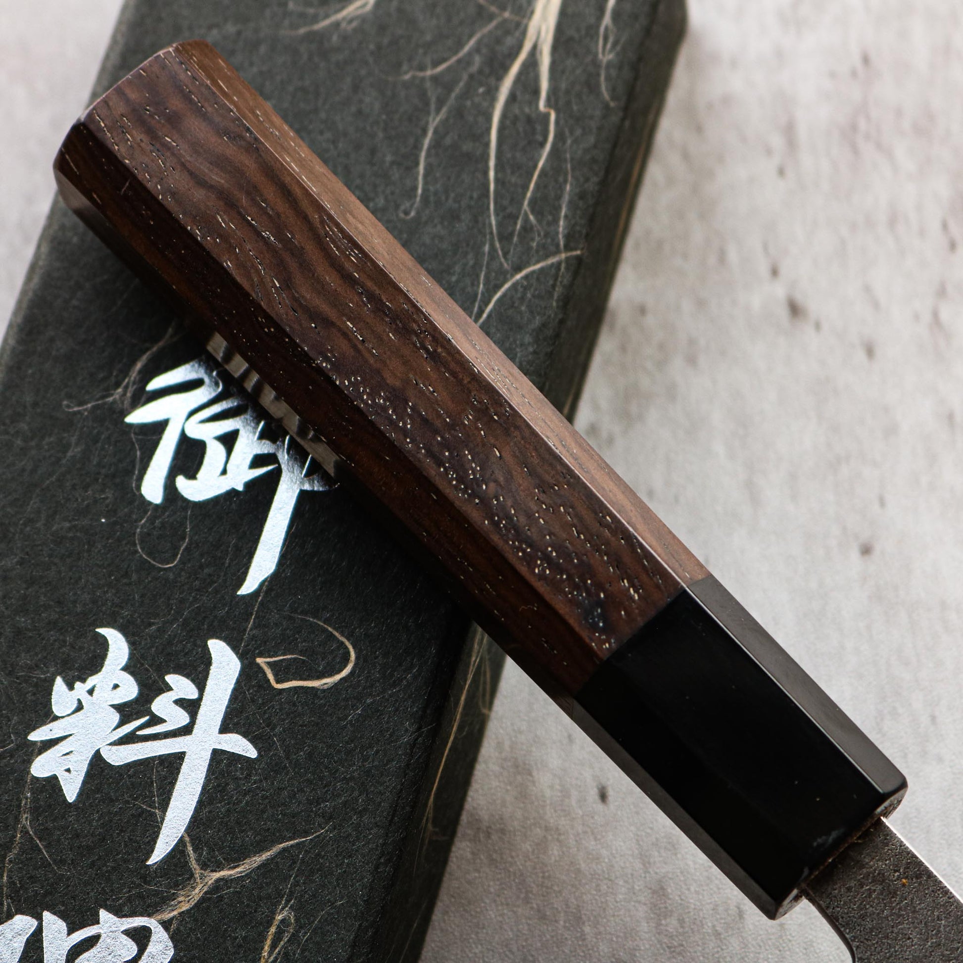 Yoshikane Hamono is regarded as one of the most well-famed, quality knife makers in Japan since its inception in 1919, they are led by Kazutoshi Yamamoto, their 4th generation Blacksmith. This knife is a stainless clad with Shirogami #2 core (white #2) steel. It has a fine grinding all the way on blade spine and super thin edge geometry with beautiful Nashiji finish on it. Of course, Laser sharp out of the box.