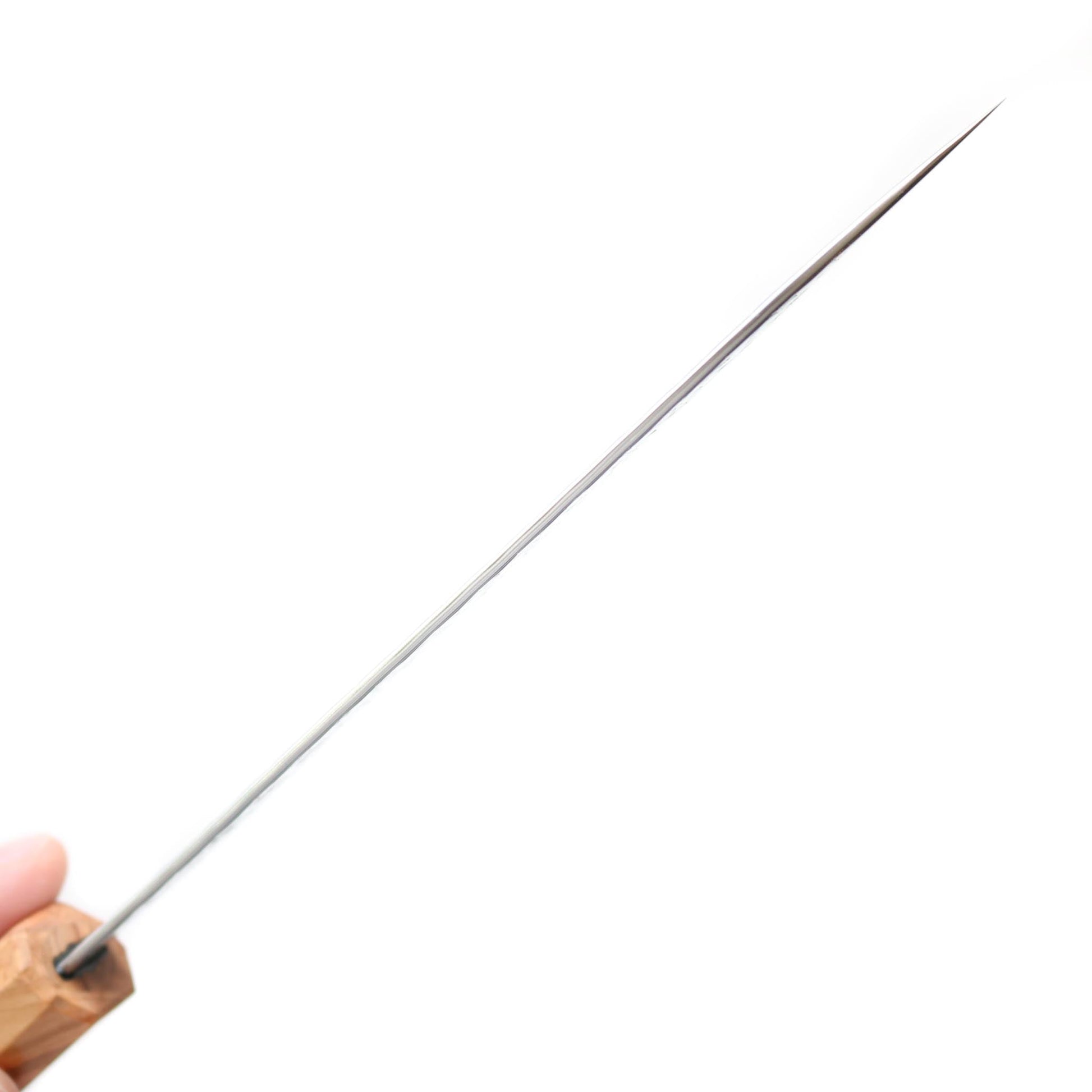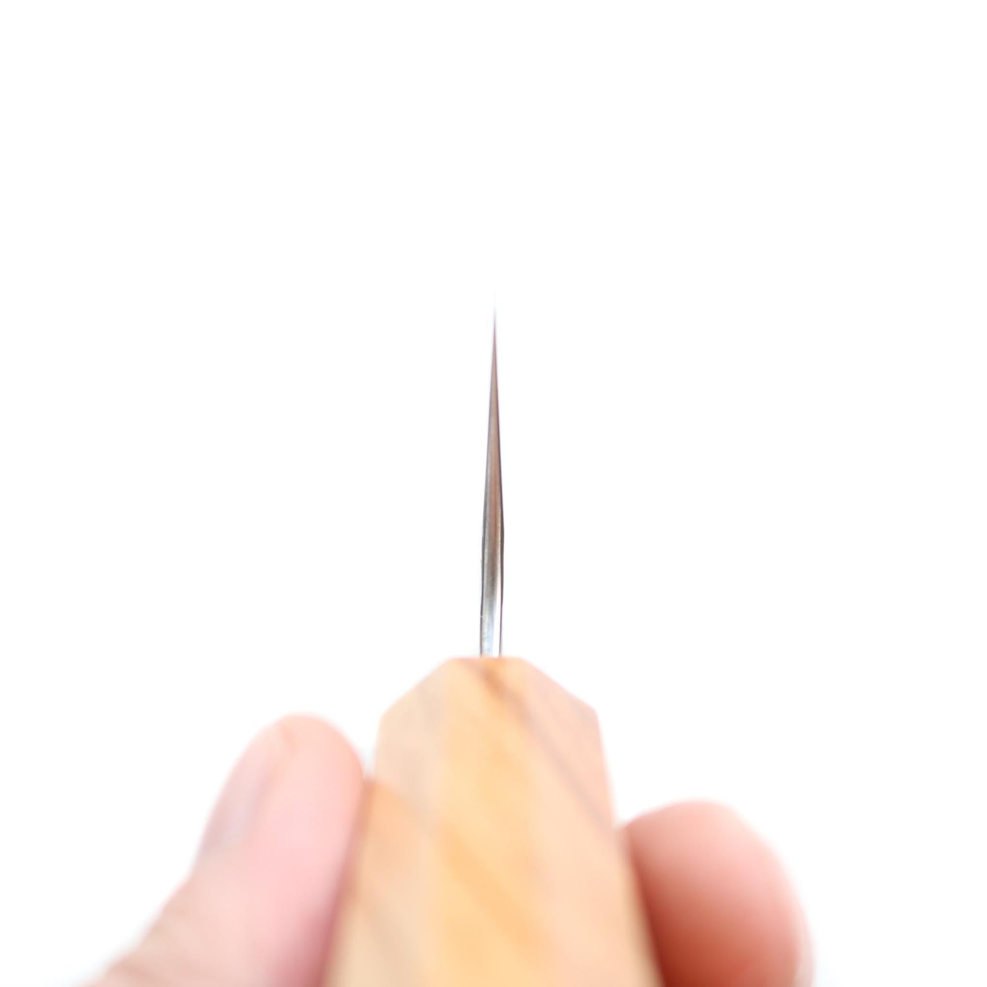 Santoku translates to three virtues. Meat, fish, and vegetables, or slicing, dicing, and chopping. No matter what way you look at it, it implies the versatility of the knife. While you sacrifice some of the slicing capability of a larger gyuto, don't be fooled by its size, the santoku can get 99% of your kitchen tasks done without breaking a sweat, which is probably why its the most popular shape in Japanese home kitchens.
