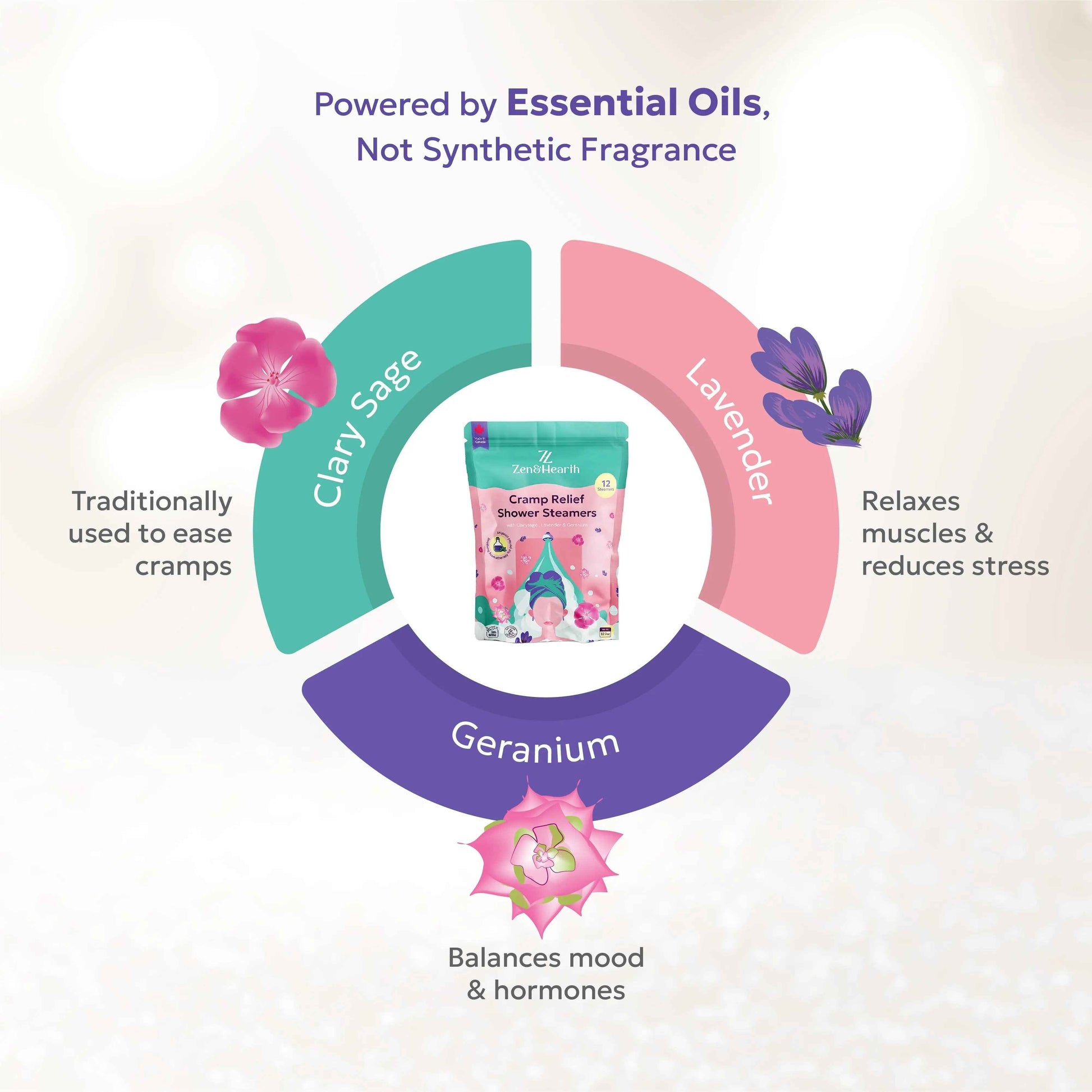 Zen & Hearth Cramp Relief Shower Steamers - Handcrafted Aromatherapy Tablets with Clary Sage, Lavender & Geranium for Period Pain Relief & Relaxation Made in Canada