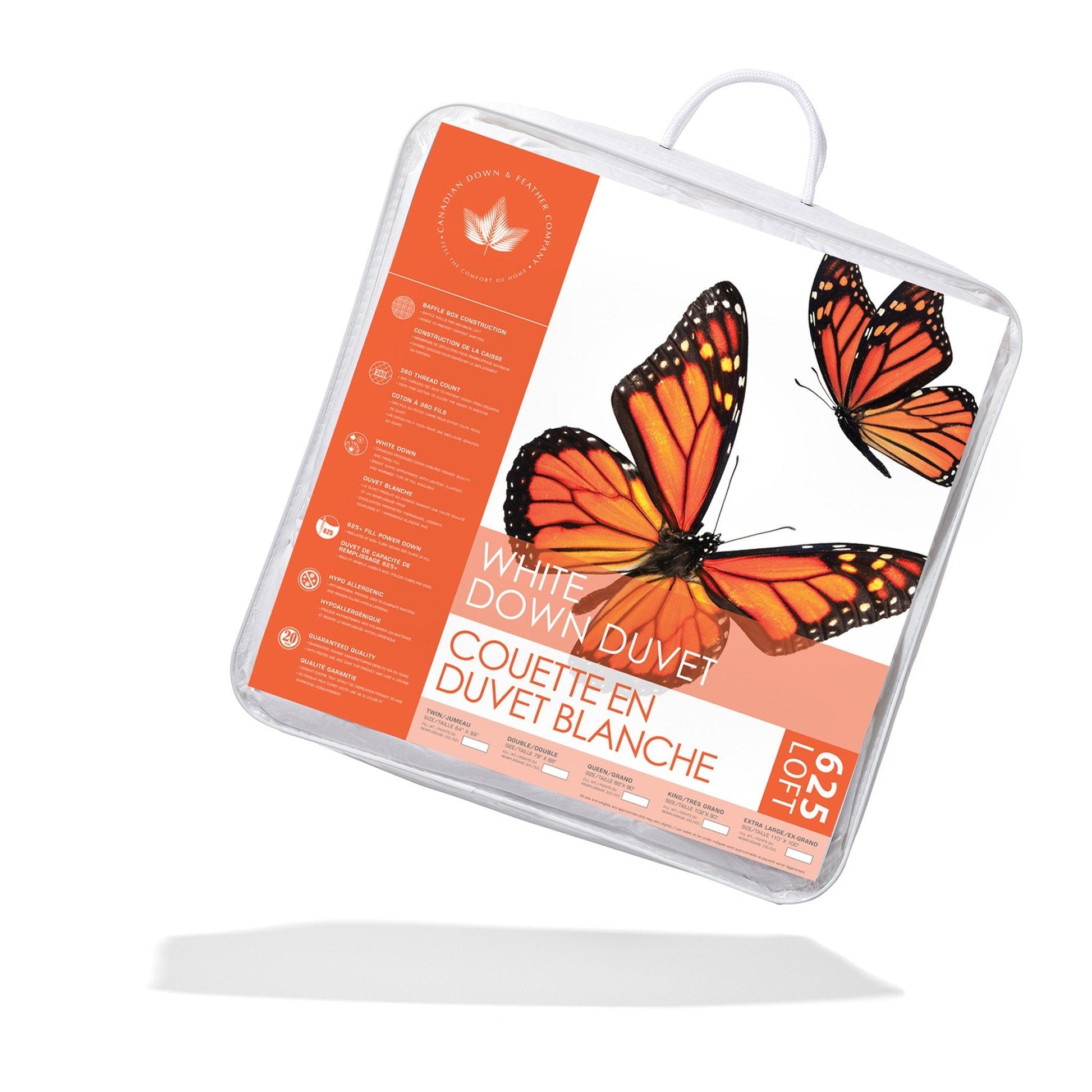 This duvet is filled with care in Canada. The cotton shell is 360 thread count, so it is soft and quiet. The duvet is filled with 625 loft duck down. Down fill is soft and luxurious, made up of tiny, fluffy clusters. This duvet is fairly lightweight, but you'll find this duvet contains more fill than a duvet with higher loft down (700 or 850). This is because the higher the loft of the down, the better the insulating properties, and the less of it we need to achieve the desired warmth level! Conversely, you'll find it has less fill than a duvet with lower loft down (550 or 575).