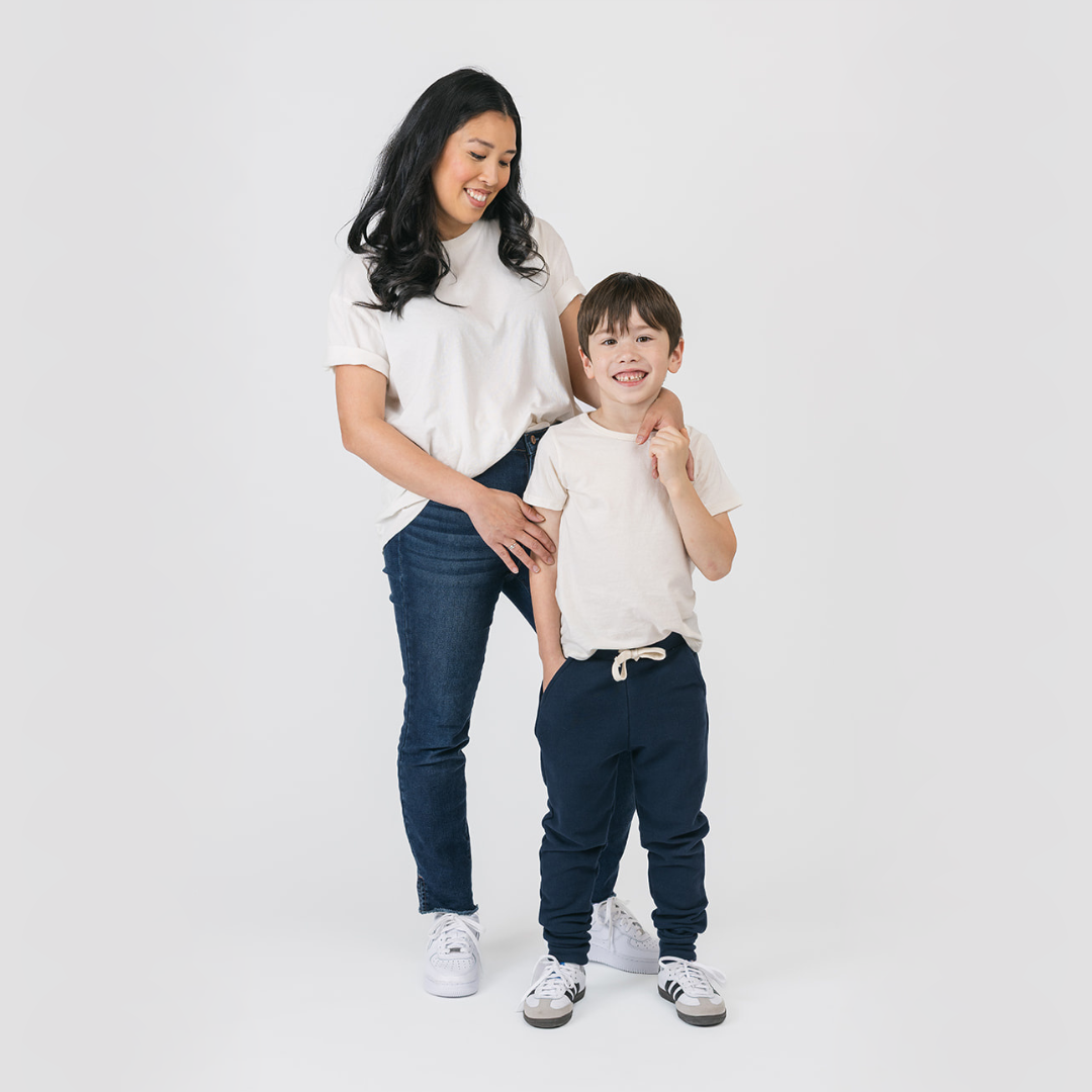 The fit is casual and straight: unisex, slouchy, with just the right drape - size up for a truly oversize fit (the mums pictured here are all wearing an L)