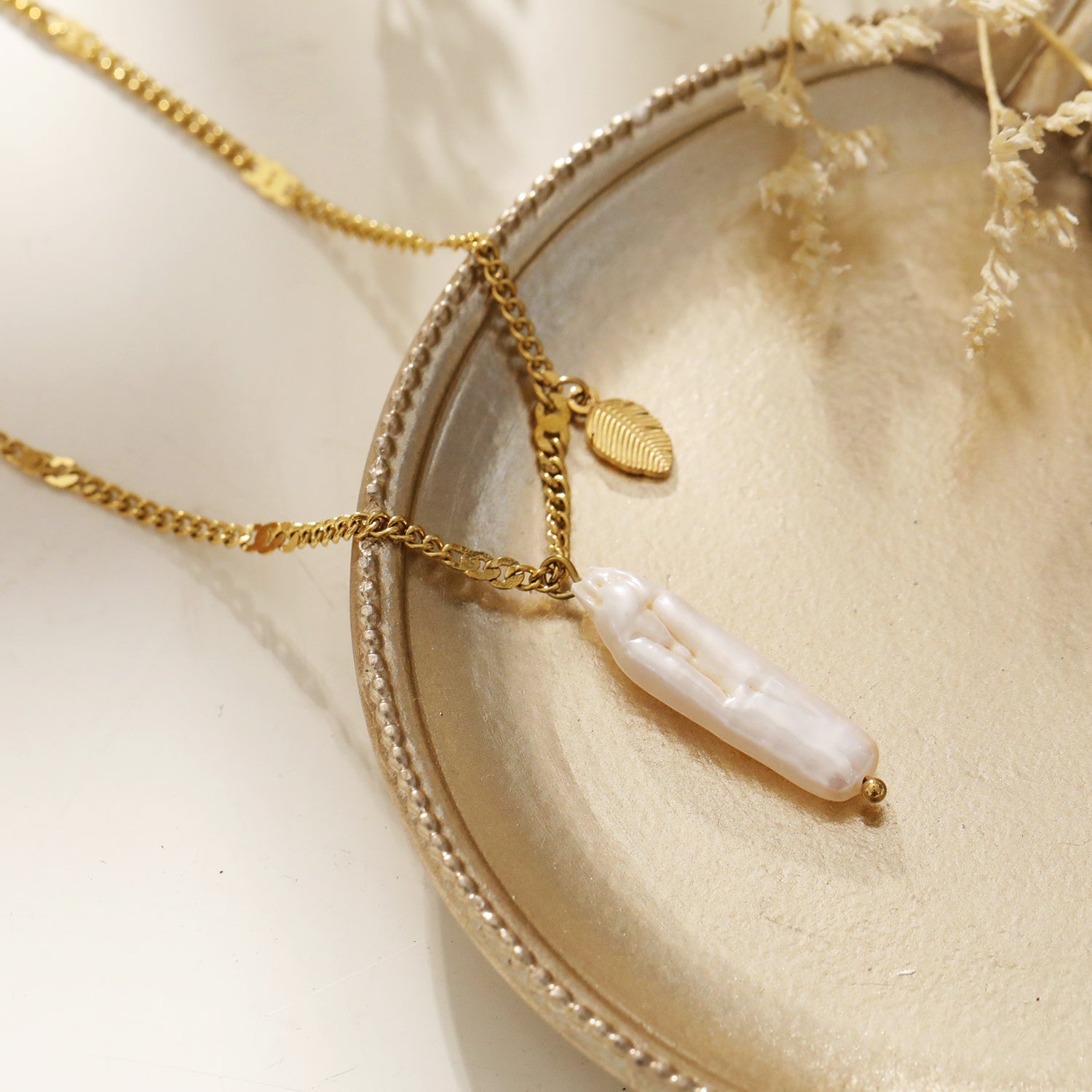 ANNECY: Nature Inspired Chic Chain Necklace Enhanced with Baroque Pearl and Leaf Charm