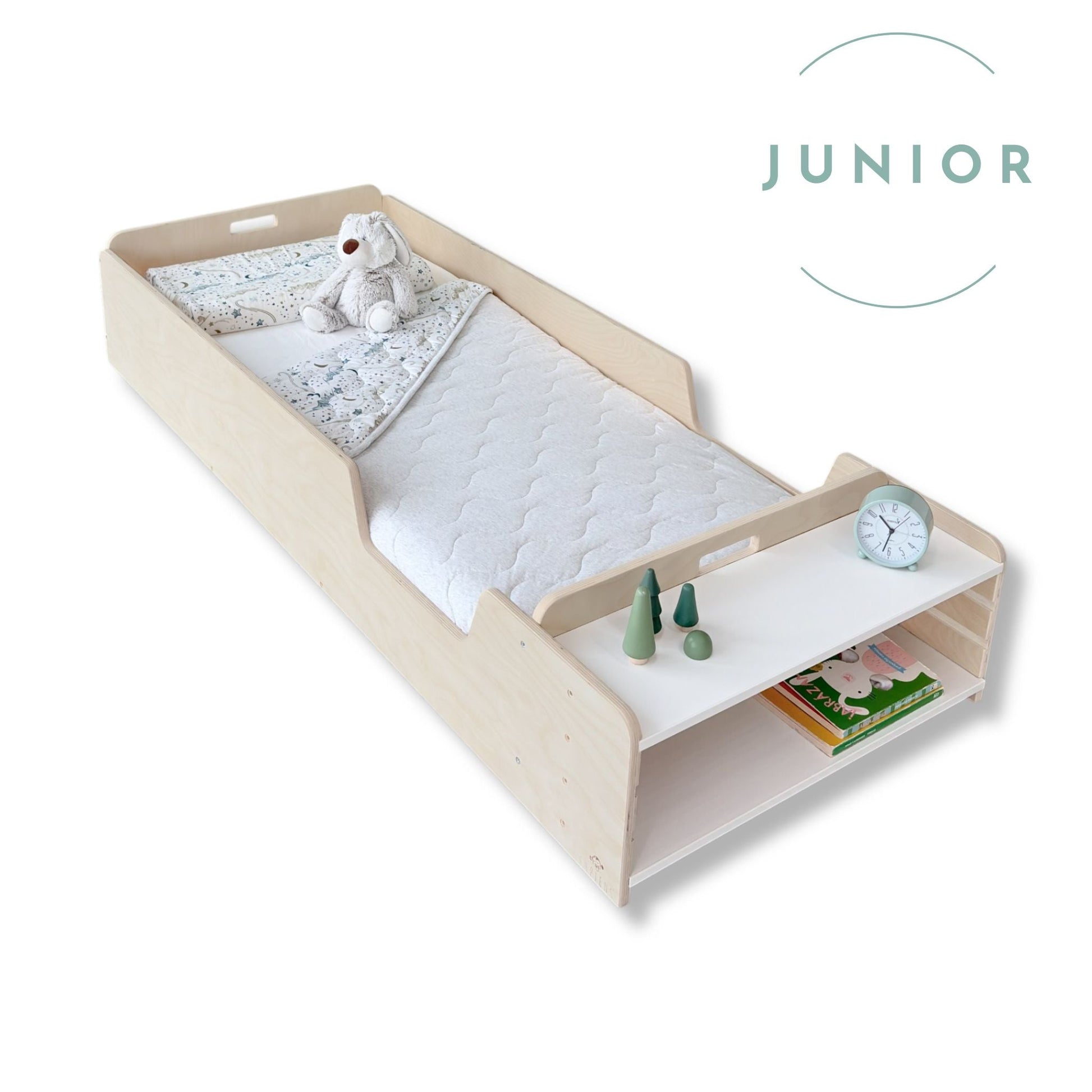 APPLE JUNIOR - Montessori Floor Bed with Rails & Shelves