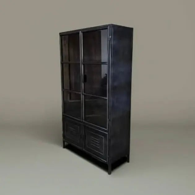 Armoire vintage en acier noir avec porte vitrée et porte style casier dans le bas.