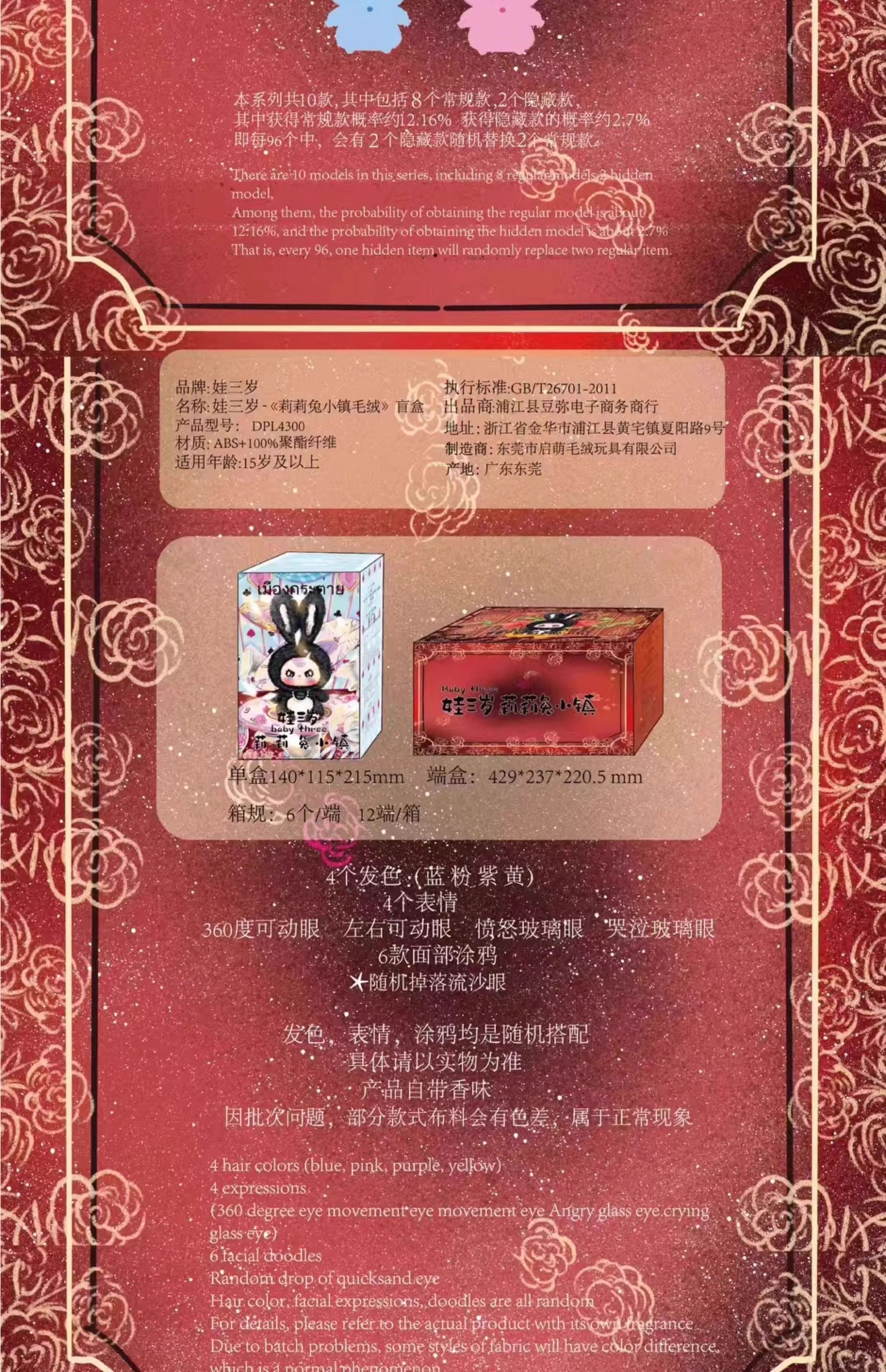 Discover the magical world of Lily Rabbit Town with the Baby Three Lily Rabbit Town Series Plush Dolls. Made with high-quality polyester fiber, these 18 cm dolls offer a soft and cuddly experience. Each blind box contains a random plush doll from the series, featuring one of 6 unique designs of Lily Rabbit in adorable outfits. Unbox the mystery and collect them all!