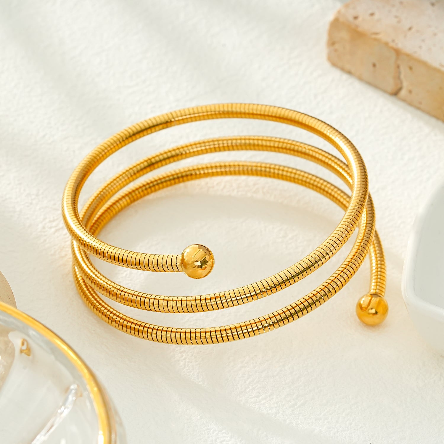 This piece is a blend of innovative design & classic aesthetics featuring an extended cable wire twisted to form a triple stacked bracelet. At each end of the bracelet, finely balanced ball beads add a touch of refinement and balance to the overall design. Surface lines add depth and visual interest.Â