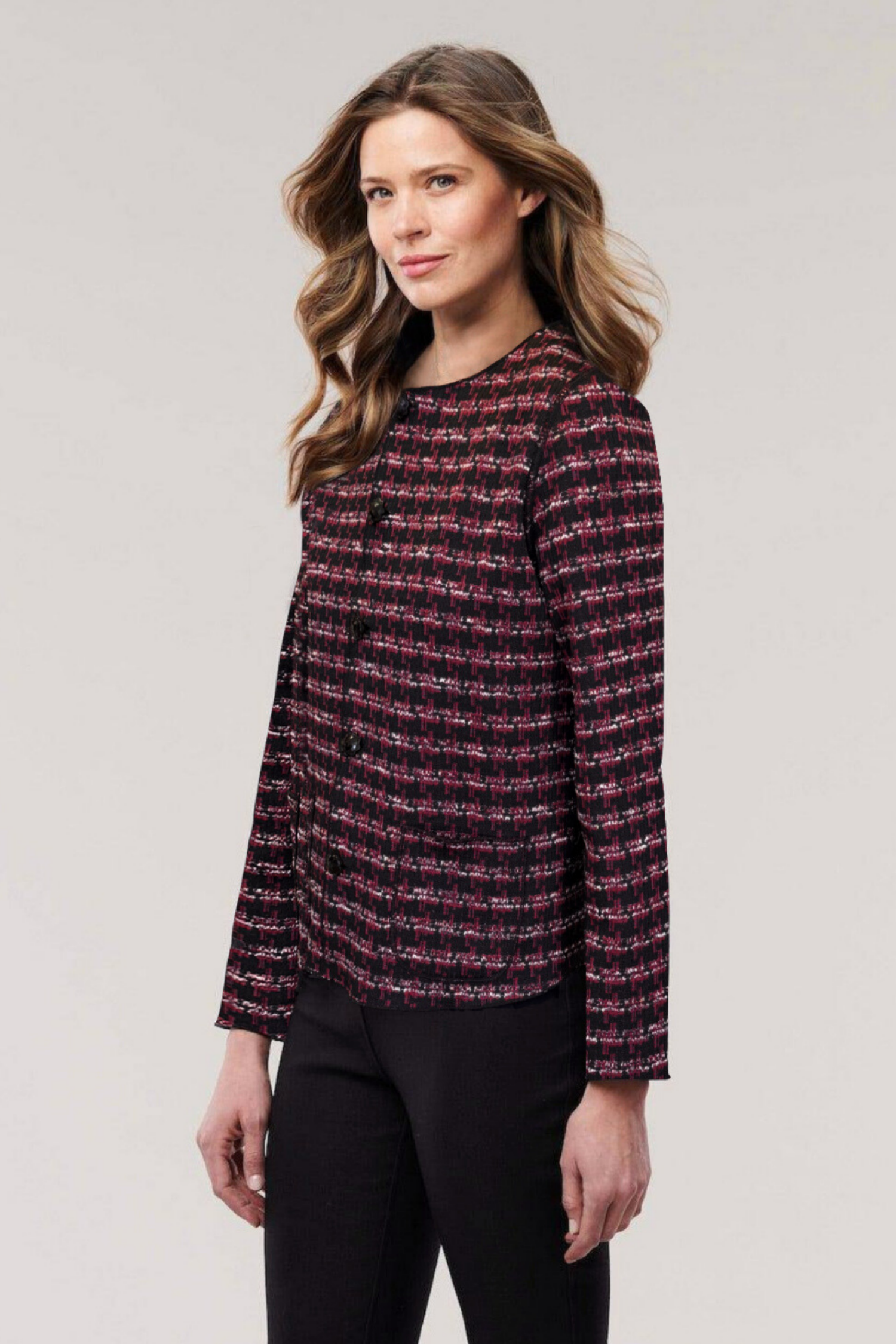 Meet the Catania Reversible Jacket—a travel essential designed for women who demand style, function, and comfort for every journey. Thoughtfully crafted with two chic looks in one, this jacket seamlessly flips from a beautiful burgundy houndstooth knit jacquard to a sleek solid black scuba, giving you maximum versatility without extra packing. The reversible button closures on both sides ensure a polished yet relaxed fit, whether you’re heading to a client meeting, exploring a new city, or enjoying a night out.