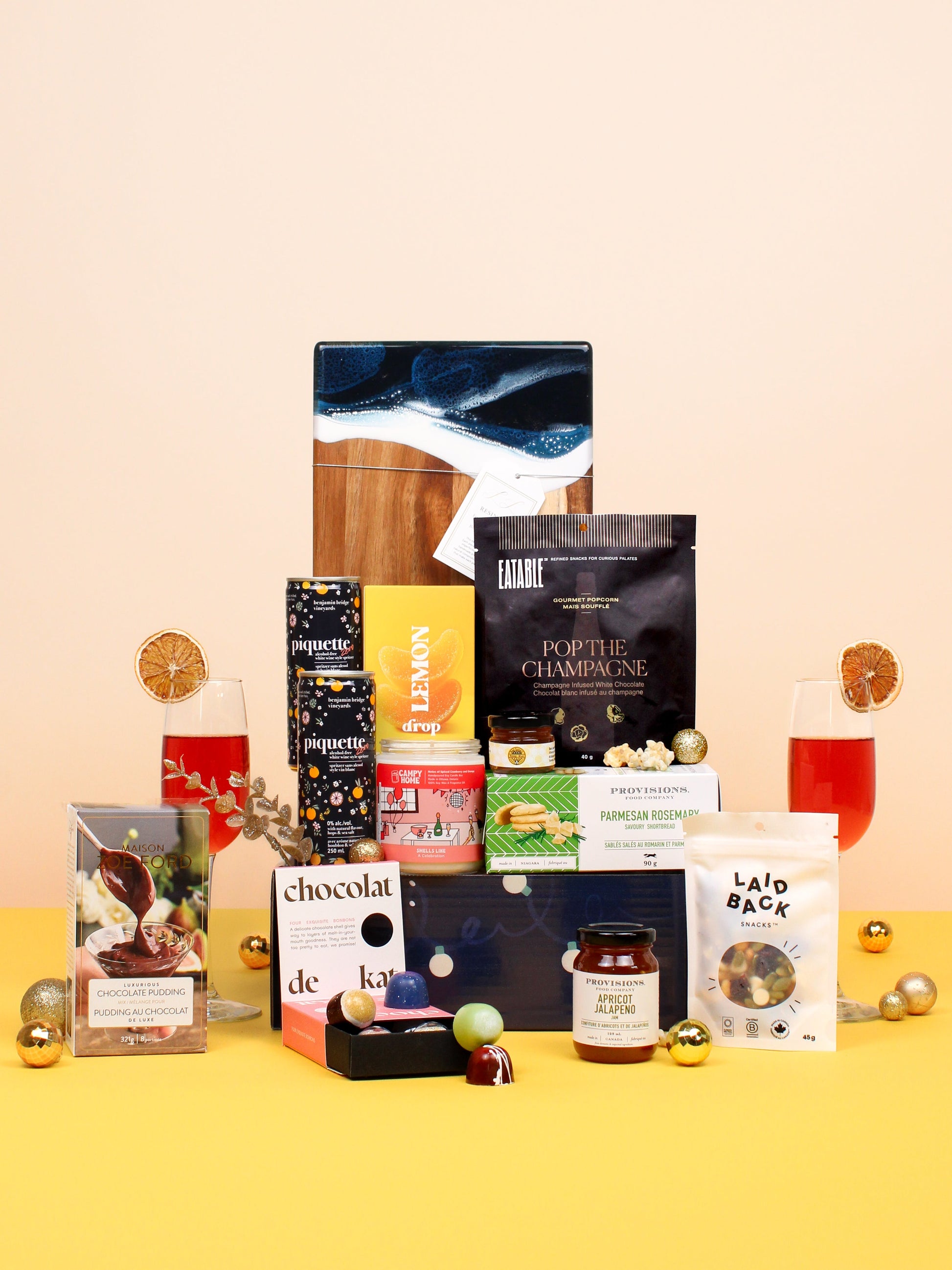 Raise a toast to the season with a box that feels festive from the inside out. Canadian-made highlights — a charcuterie board, crackers, jams, nuts, non-alcoholic drinks, and a celebratory candle — create the perfect spread. A lively gift that turns any gathering into a celebration.