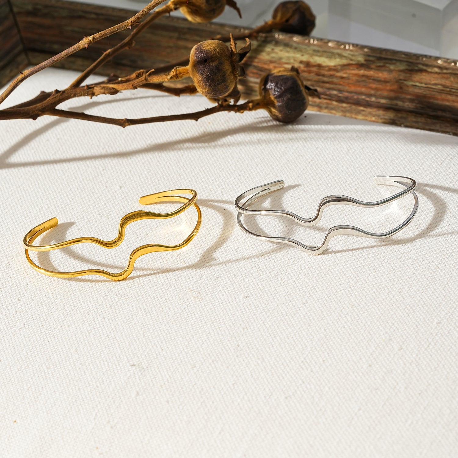 Elevate your style with our industrial-chic inspired bracelet, expertly designed with a pair of abstract shaped bands stacked for a striking and contemporary look. This unique piece combines the rugged appeal of industrial design with the elegance of modern jewelry, making it a must-have accessory for the fashion-forward individual.
