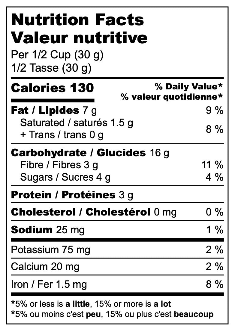 INGREDIENTS: Organic gluten free oats, Sugars (organic maple syrup), Pumpkin seeds, Avocado oil, Pecans, Hazelnuts, Organic cocoa, Chocolate chips (cane sugar, unsweetened chocolate, cocoa butter), Coconut, Organic cacao nibs, Vanilla extract, Sea salt, Organic cinnamon