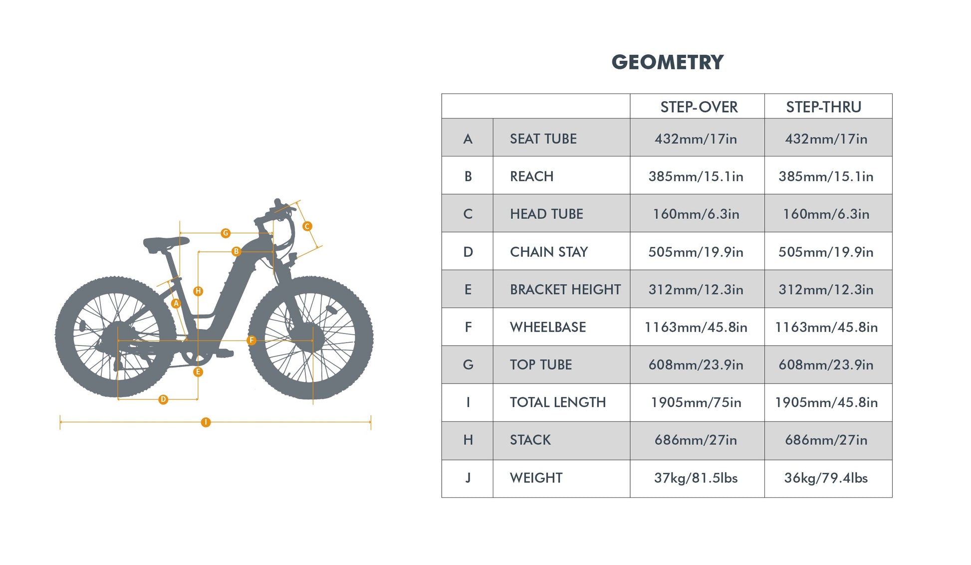 - Weight: Step-over 81.5 lbs, step-thru 79.4 lbs