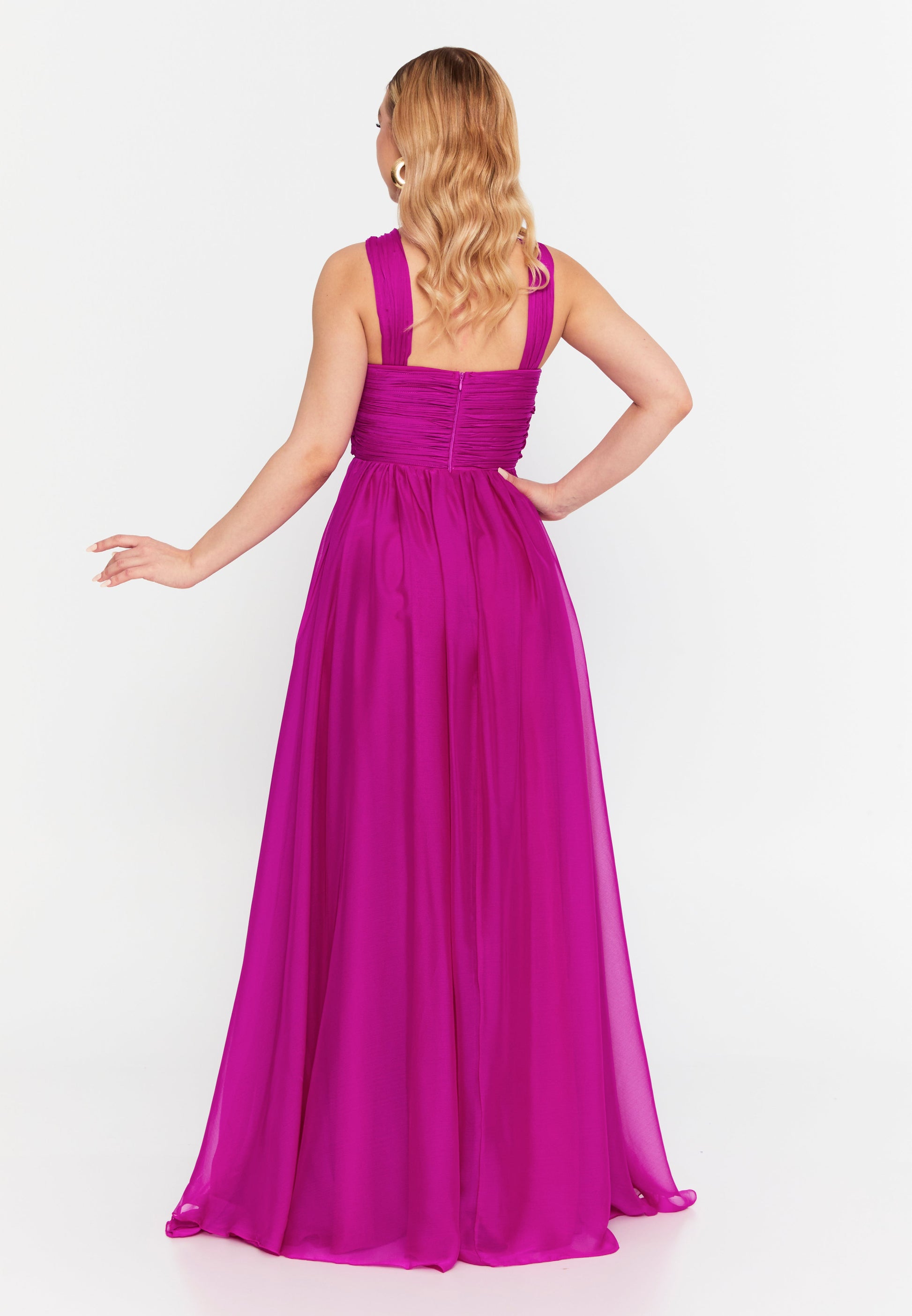 Elegant plus-size fuchsia chiffon maxi dress featuring crisscross straps, ruched bodice, and keyhole detail — perfect for weddings, prom, or summer events.