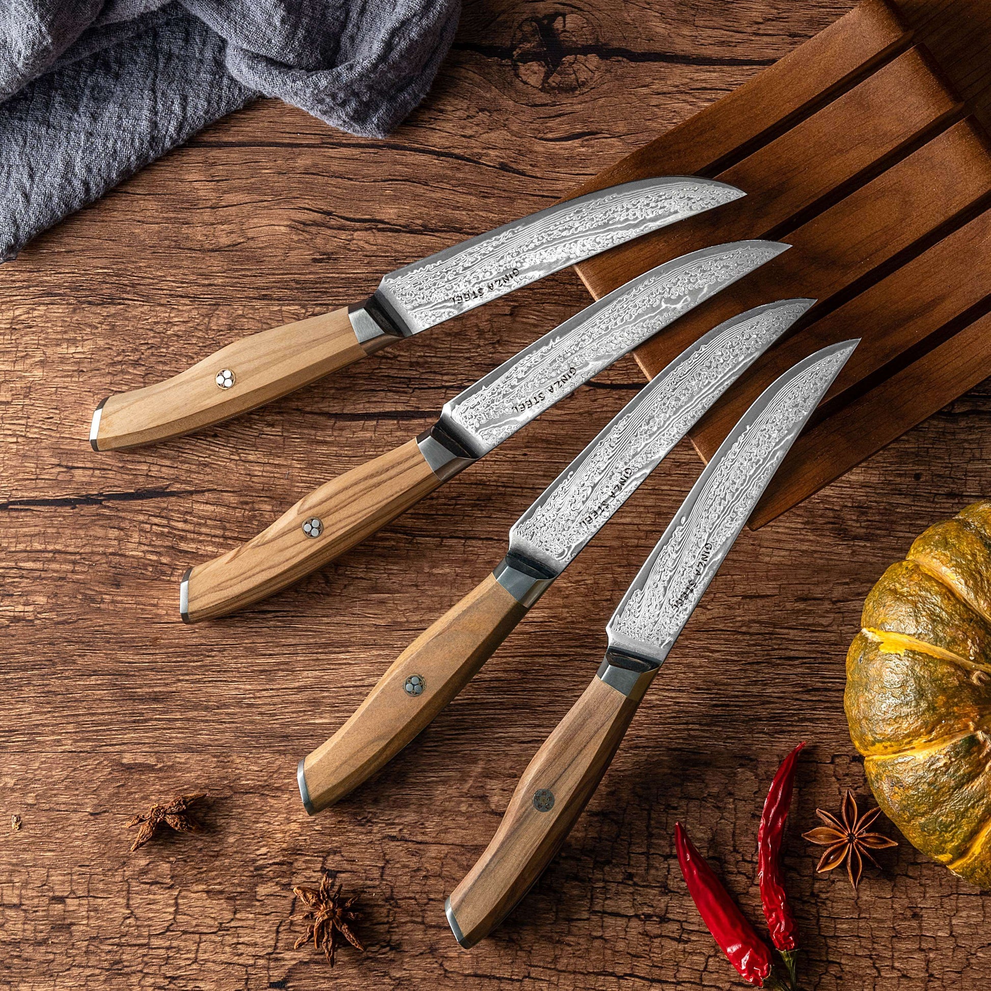 The Ginza Steel AMELIA Five set includes four 5-inch steak knives crafted from VG10 Damascus steel for exceptional sharpness and durability. Presented with a stylish wood block, this set is perfect for elegant dining and precise cutting.