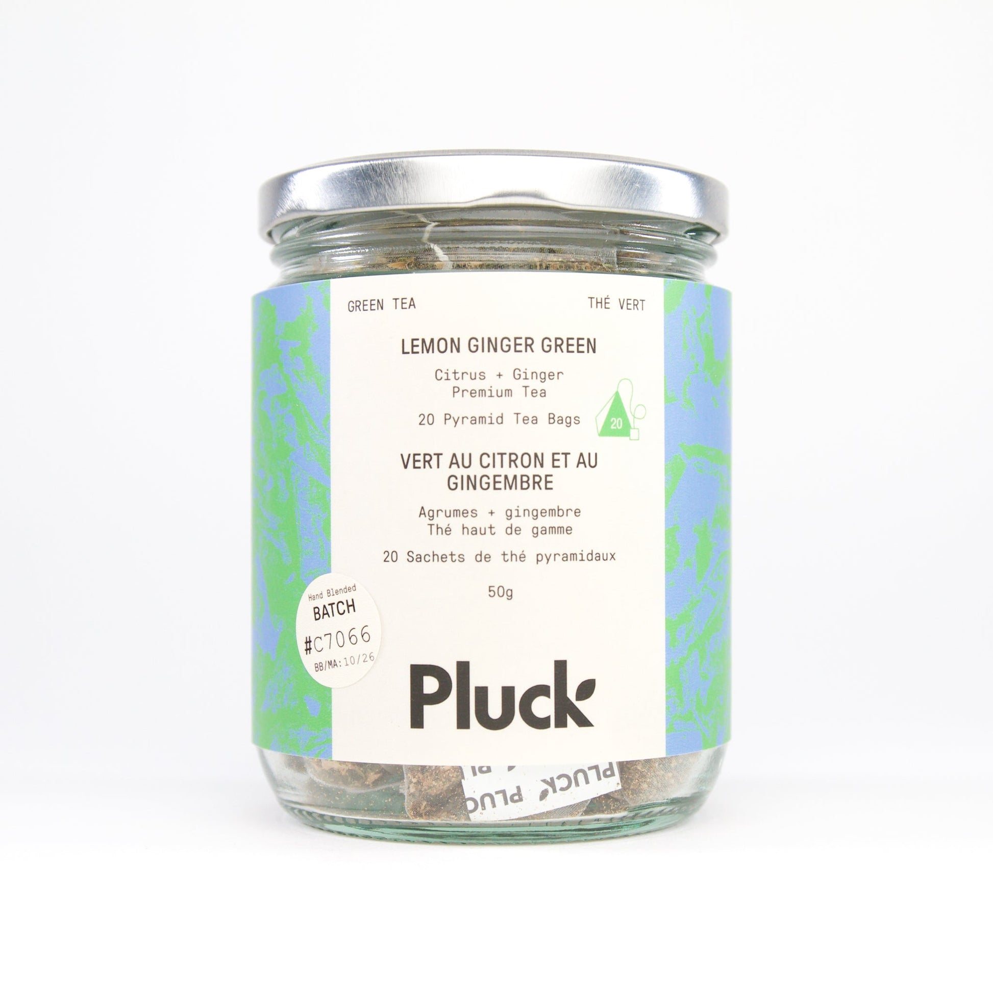 100% natural ingredients, blended and packed in Canada: Green Tea, Dried Ginger Root Pieces, Upcycled Lemon Peel