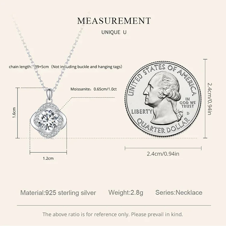 Embrace good fortune and timeless elegance with this stunning Sterling Silver Pendant Necklace featuring a radiant 1ct Moissanite gemstone in a four-leaf clover design. The exquisite cut and exceptional clarity of the Moissanite create a breathtaking display of brilliance. The delicate chain adds a touch of sophistication, making it perfect for both casual and formal occasions. Let this lucky charm elevate your style and inspire your confidence.