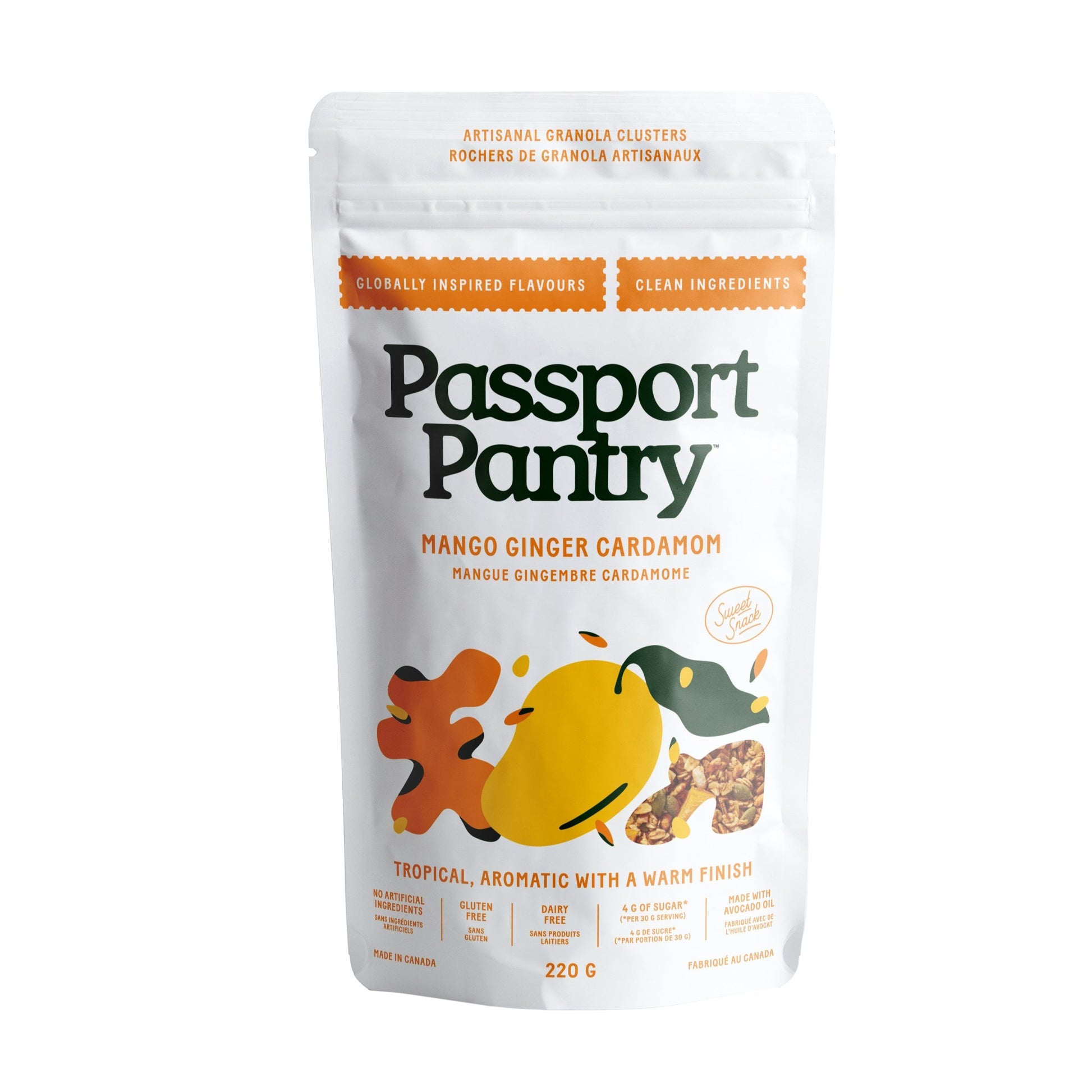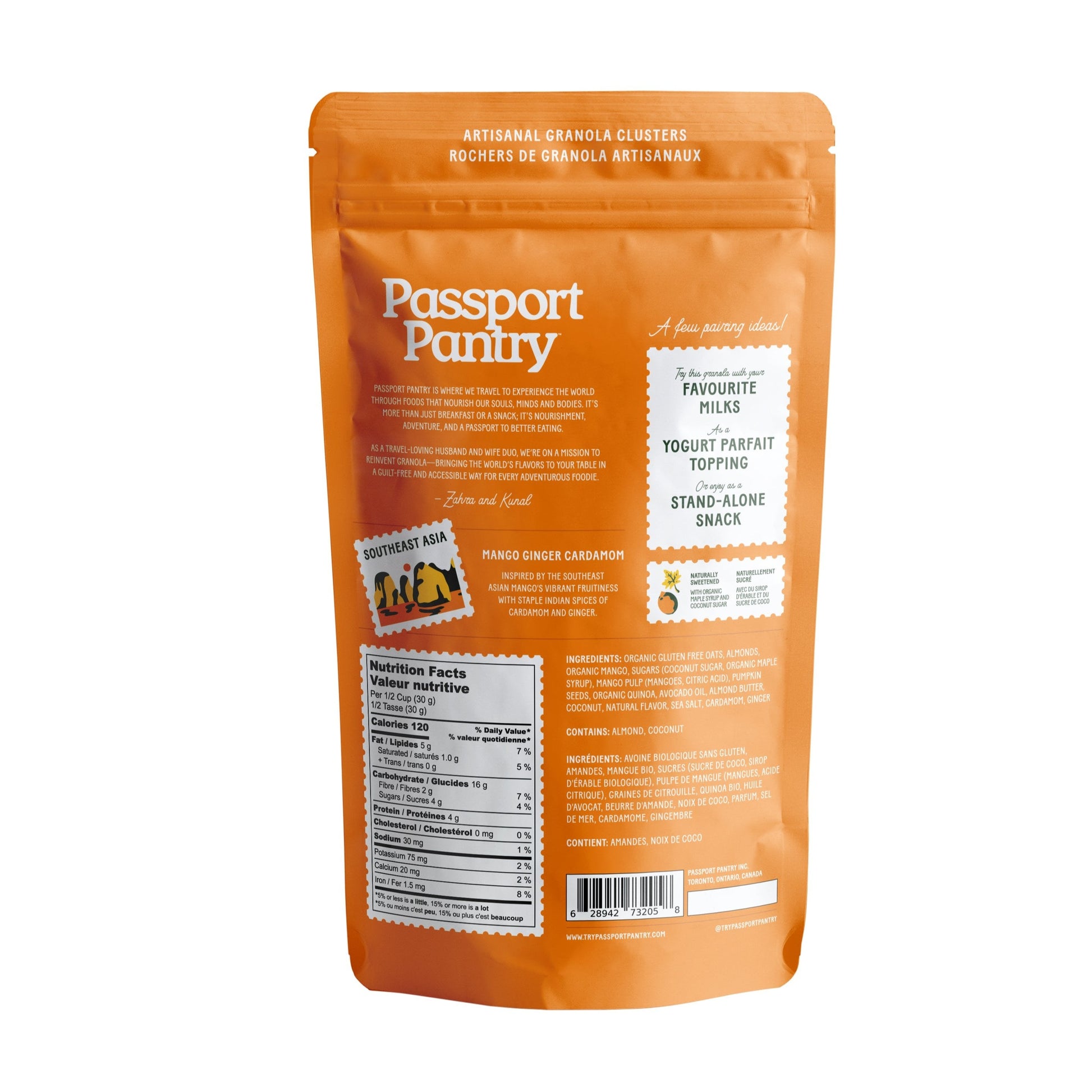 INGREDIENTS:Â Organic Gluten Free Oats, Almonds, Organic Mango, Sugars (Coconut Sugar, Organic Maple Syrup), Mango Pulp (Mangoes, Citric Acid), Pumpkin Seeds, Organic Quinoa, Avocado Oil, Almond Butter, Coconut, Natural Flavor, Sea Salt, Cardamom, Ginger