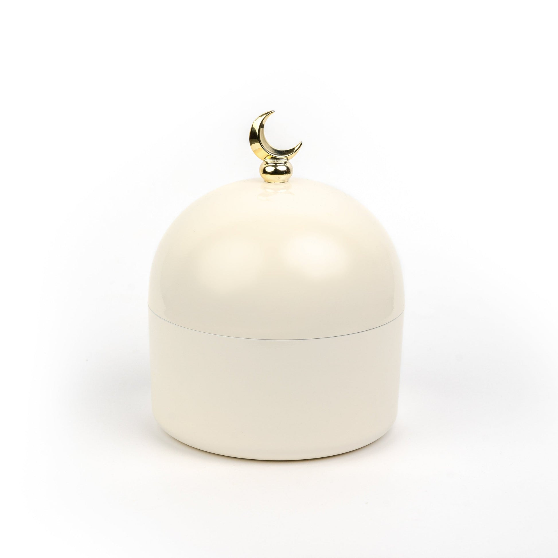 A versatile home decor piece for Ramadan, Eid, or any time of the year. This beautifully crafted, dome-shaped jar with a crescent moon handle allows you to present your guests with dates, sweets, and other desserts with a touch of elegance and flair.