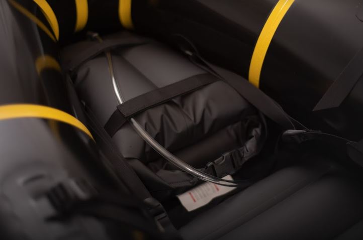 The MRS Viking Self Bailer comes with an optional internal storage system (ISS), where the stern of the boat can be accessed with a water-resistant zipper and the side tubes can be stuffed with more storage. This actually proves to be an advantage in handling the boat and does not affect buoyancy. However, once you open the zip, the craft deflates, so you will want to be strategic about what you store in the side tubes. Using a drybag will make it easy to access your gear from the side tube.