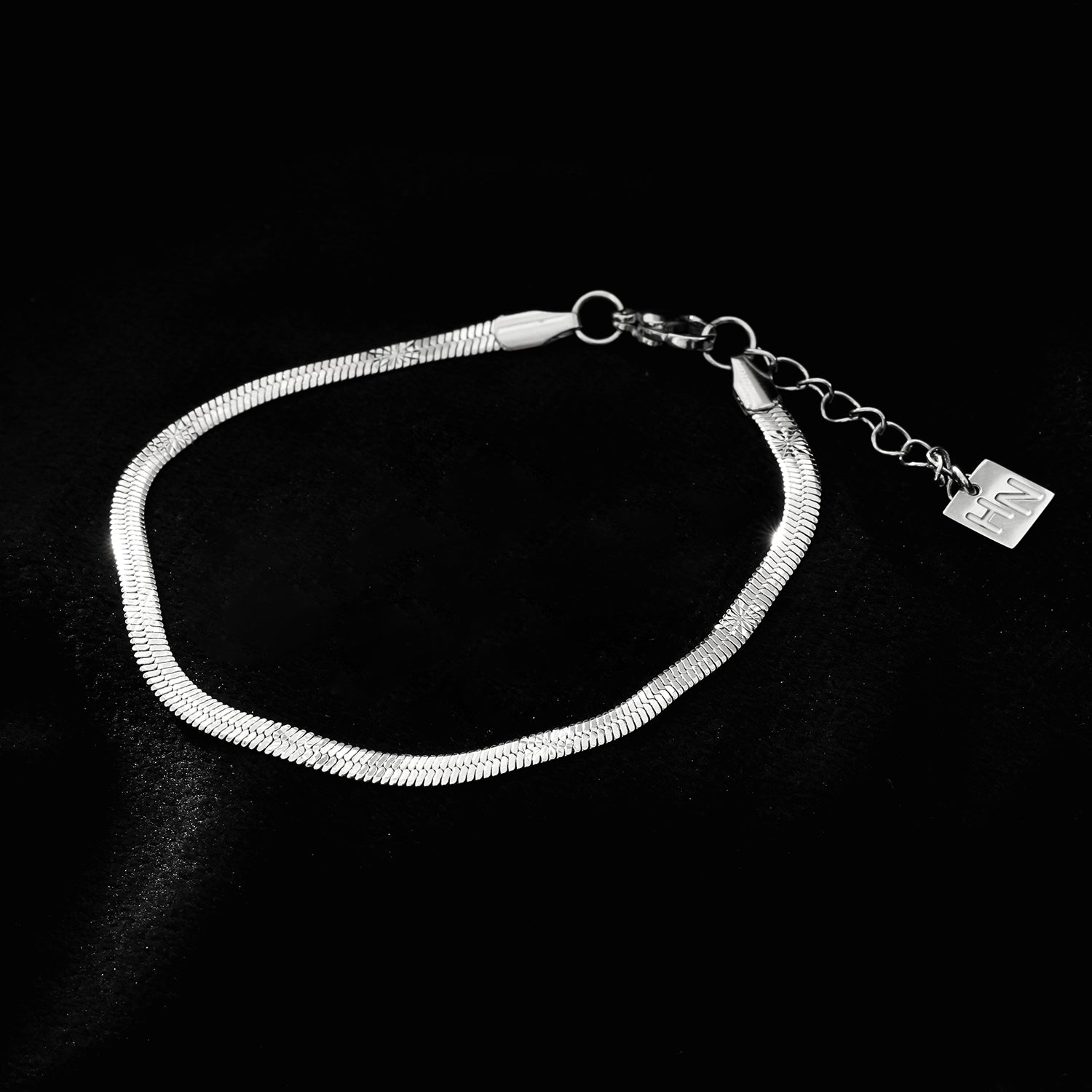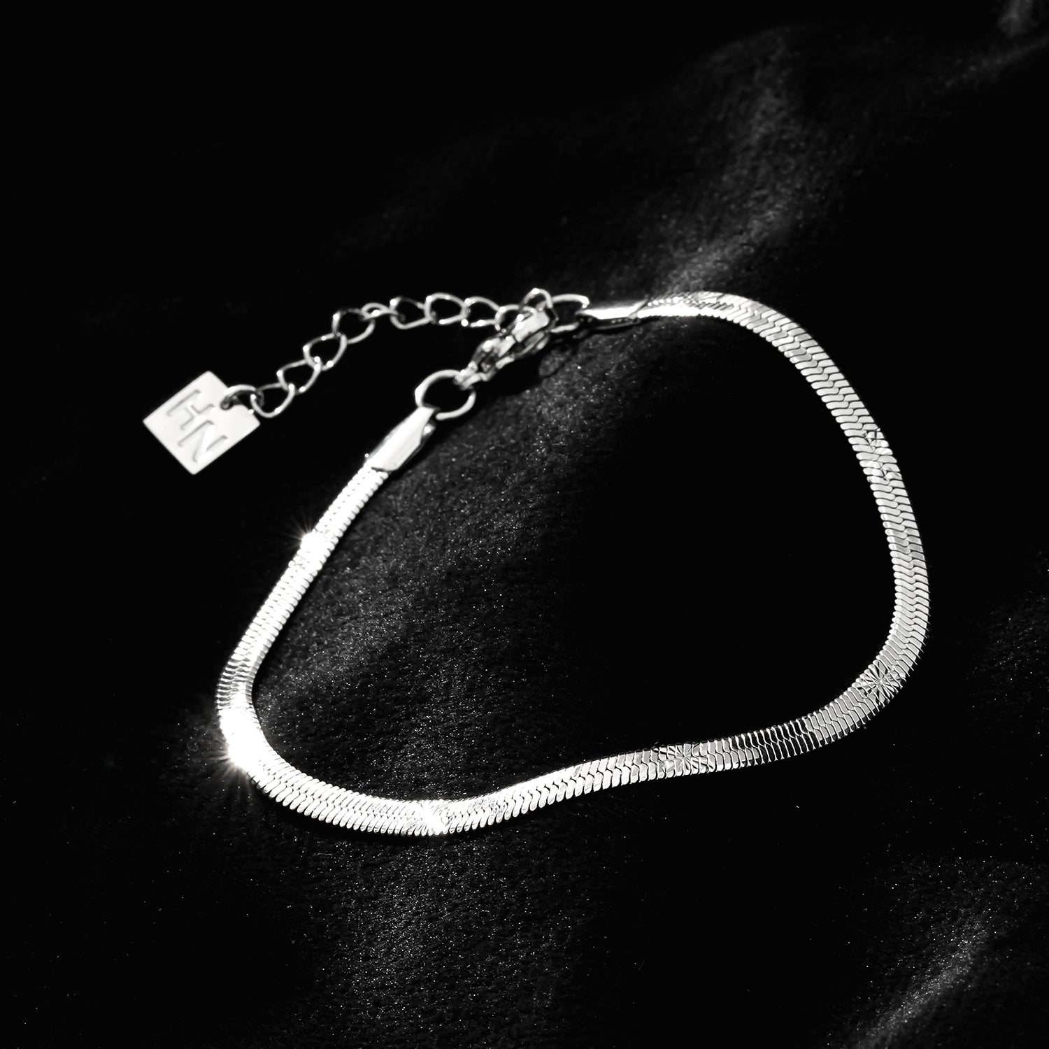 Add a stylish touch to your ensemble with this delicate & understated refined silver snake chain bracelet with a star design embossed pattern.