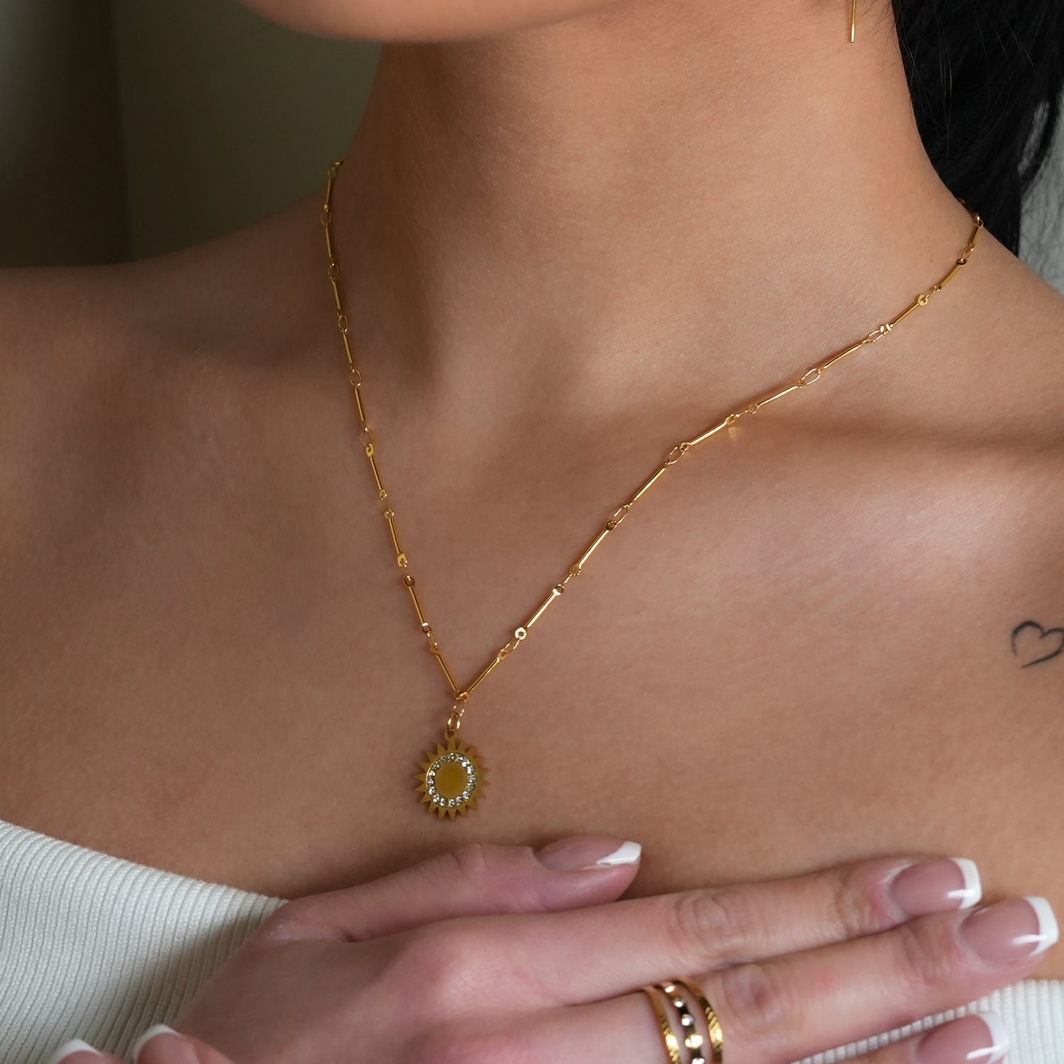 An artisan combination of elegance and contemporary design. The sun-shaped pendant, embedded with radiant zirconia gemstones, exudes a warm and vibrant energy. The interconnected chain not only enhances the pendant's charm but also symbolizes the interconnectedness of life's experiences. This necklace is a perfect accessory to brighten your ensemble and showcase your inner glow.