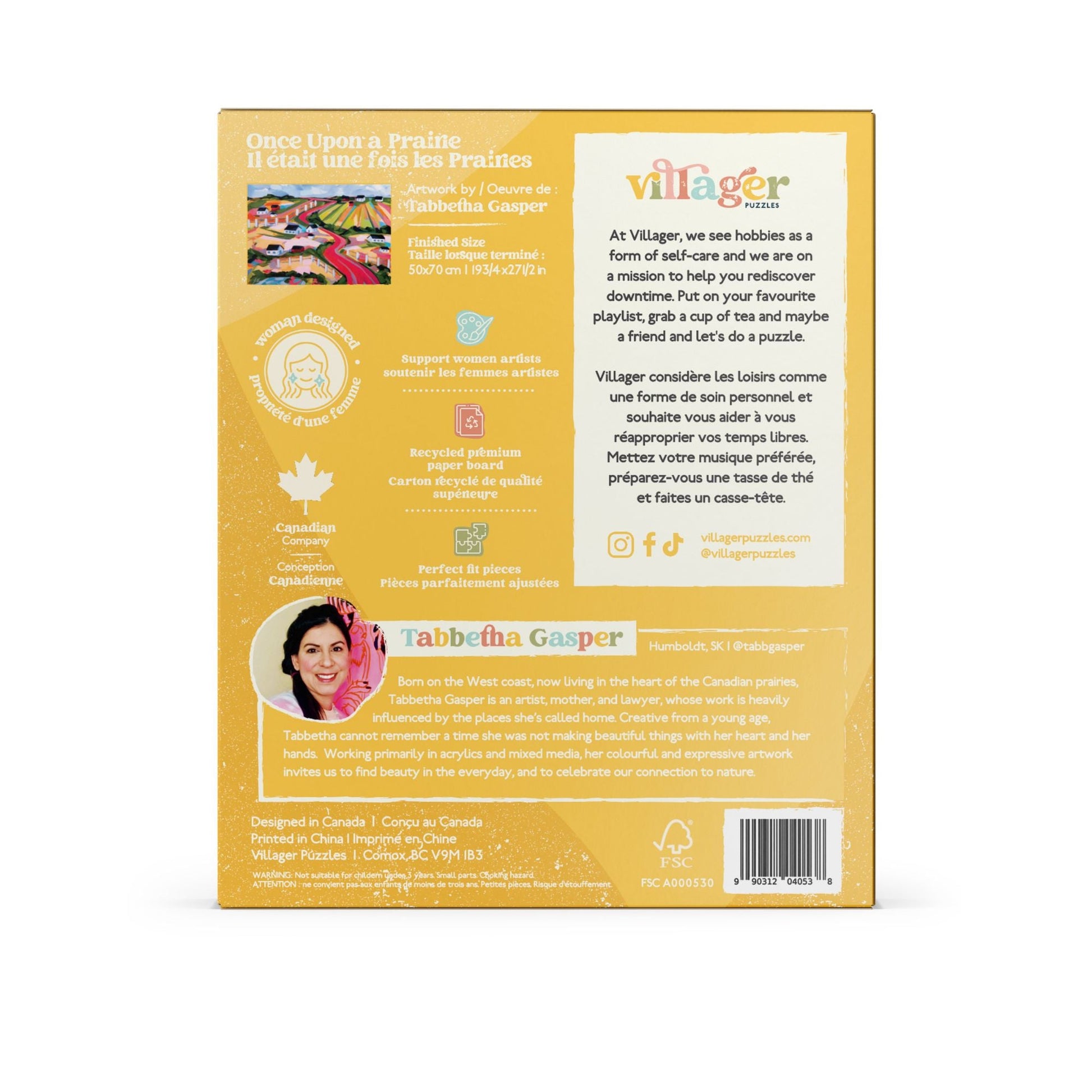 Experience the charm of small prairie towns, where friends and neighbours come together, and life is shaped by the sun, wind, and soil. This beautifully detailed puzzle, painted by Saskatchewan artist Tabbetha Gasper, captures the warmth and simplicity of rural life. A runner-up in Villager Puzzles' 2024 art competition, Once Upon a Prairie is perfect for cozy evenings with a cup of tea, shared with loved ones or savoured solo.