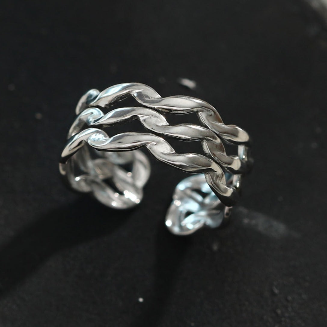 Three stacks in one ring combine with a wavy pattern to create a rich and multi dimensional aesthetic.