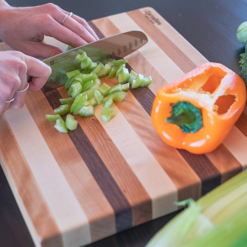 Un mélange parfait entre praticité, robustesse et élégance naturelle. Conçue à partir de véritables retailles de bois nobles, chaque planche est unique, locale et pleine de caractère — tout comme le cuisinier qui l’utilise.