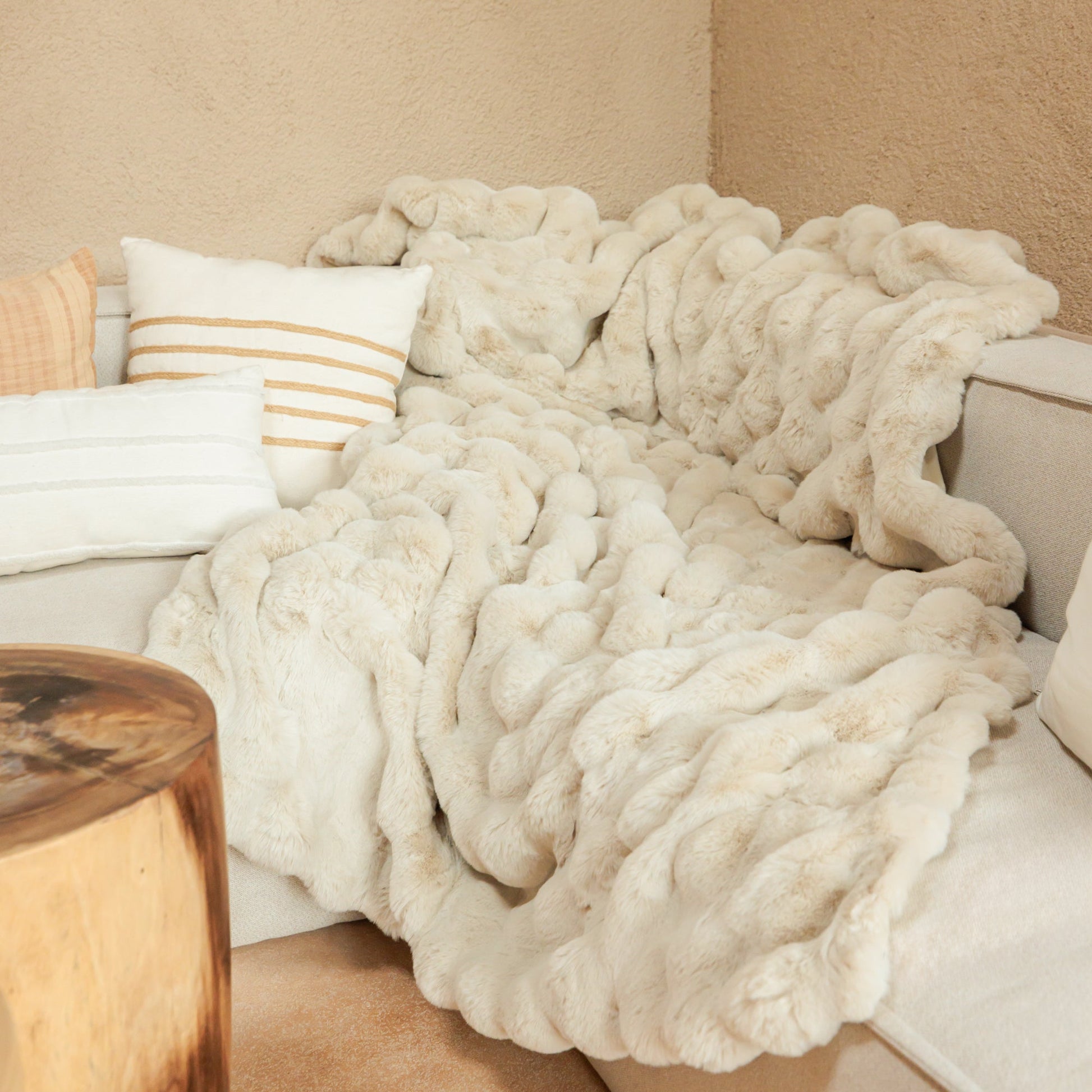 Unrivaled in coziness and luxurious feel, the new plush, dreamy faux fur blanket exquisitely emulates the authentic fur that inspired its creation. Adorned with rich, intertwined hues of tranquil browns and soothing creams, this blanket is the perfect addition to your couch, bed, or favorite relaxation spot.