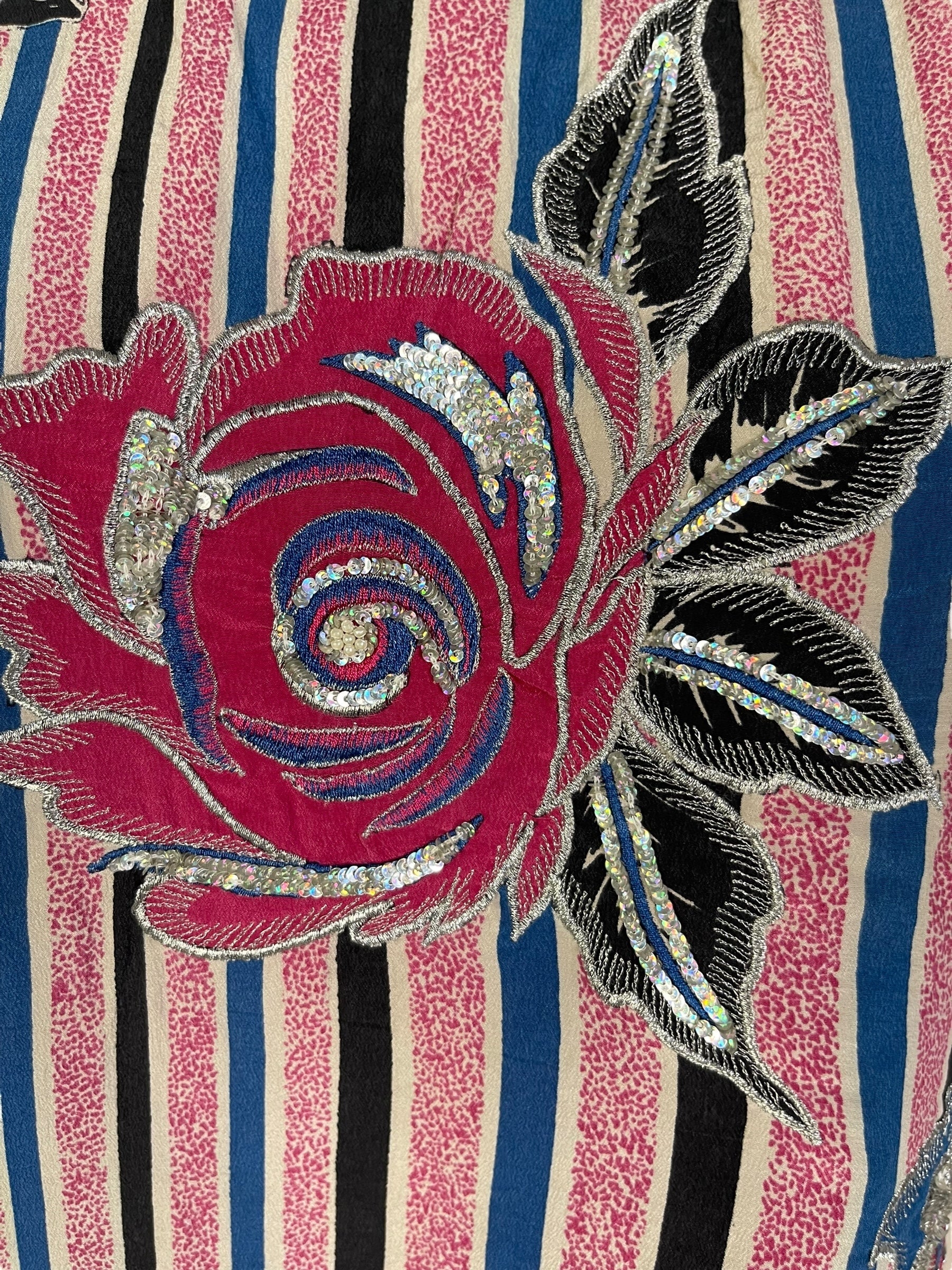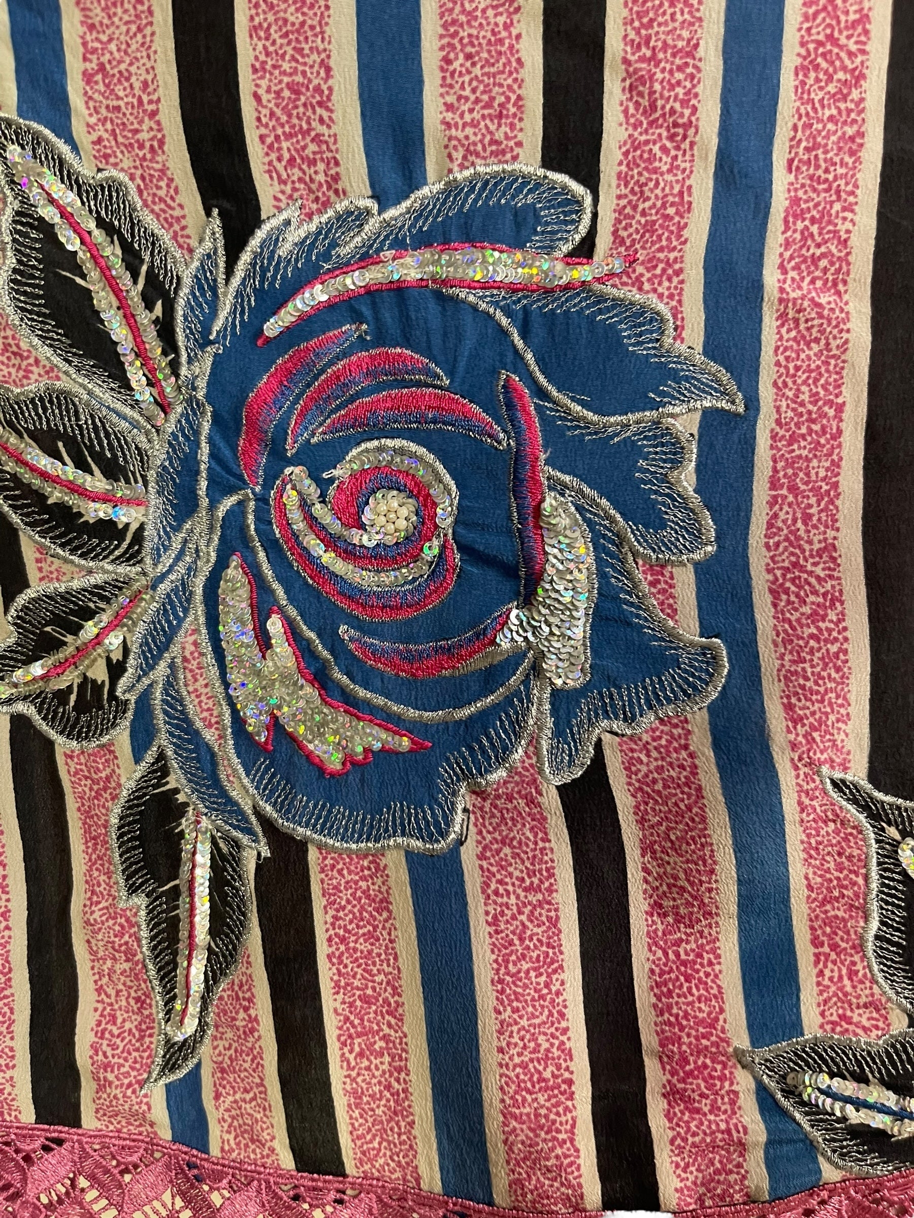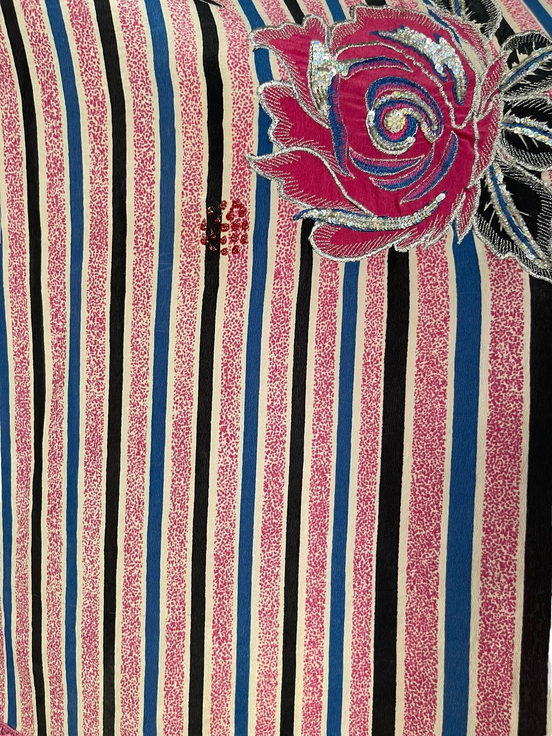 If you look very closely, you will see that the silks in this collection show some of the character of their previous incarnations through the appliqués that have been lovingly applied to bring new life to the fabric. This piece is a reminder that we are part of a collective journey to which we all add a little something.