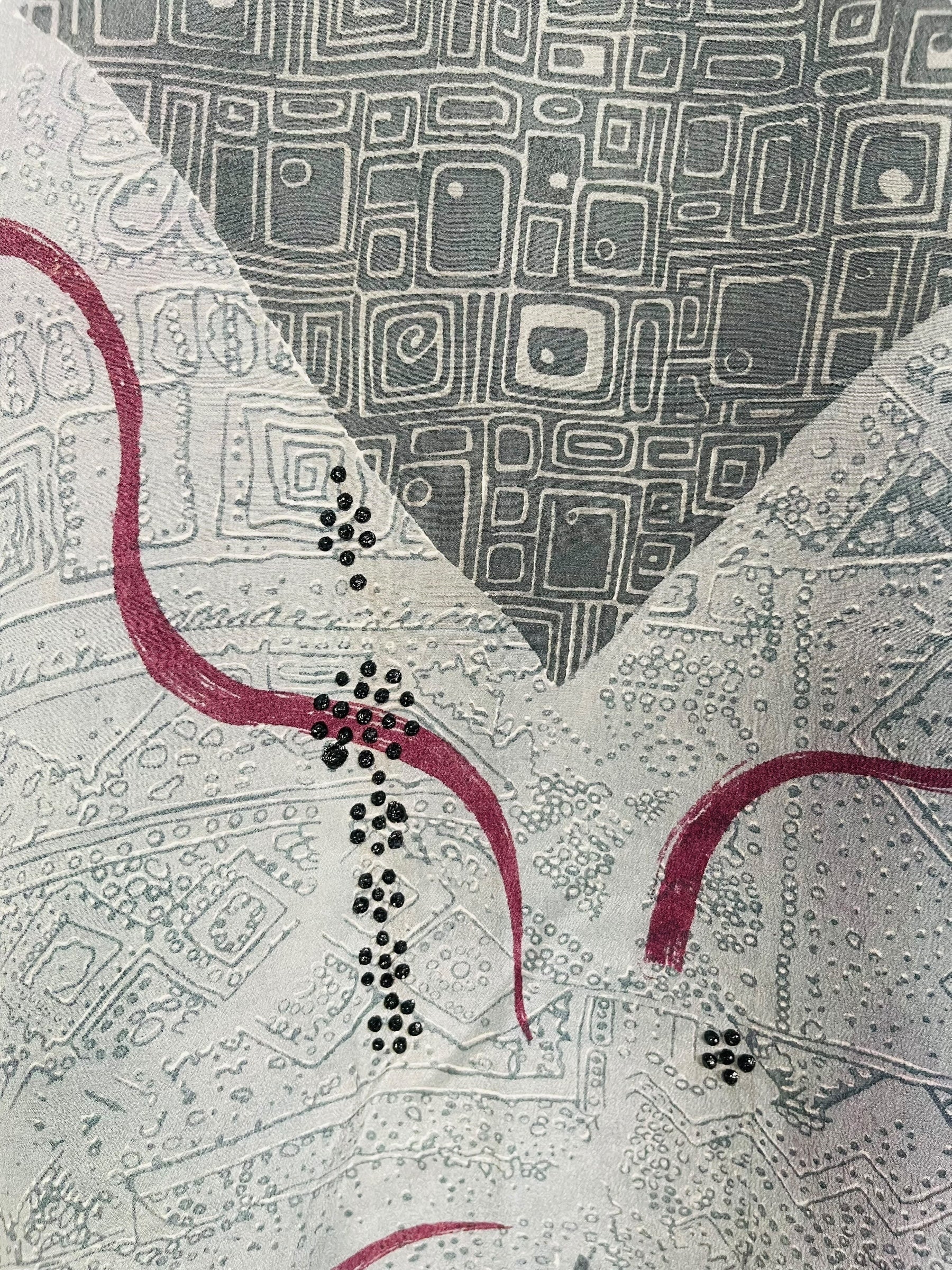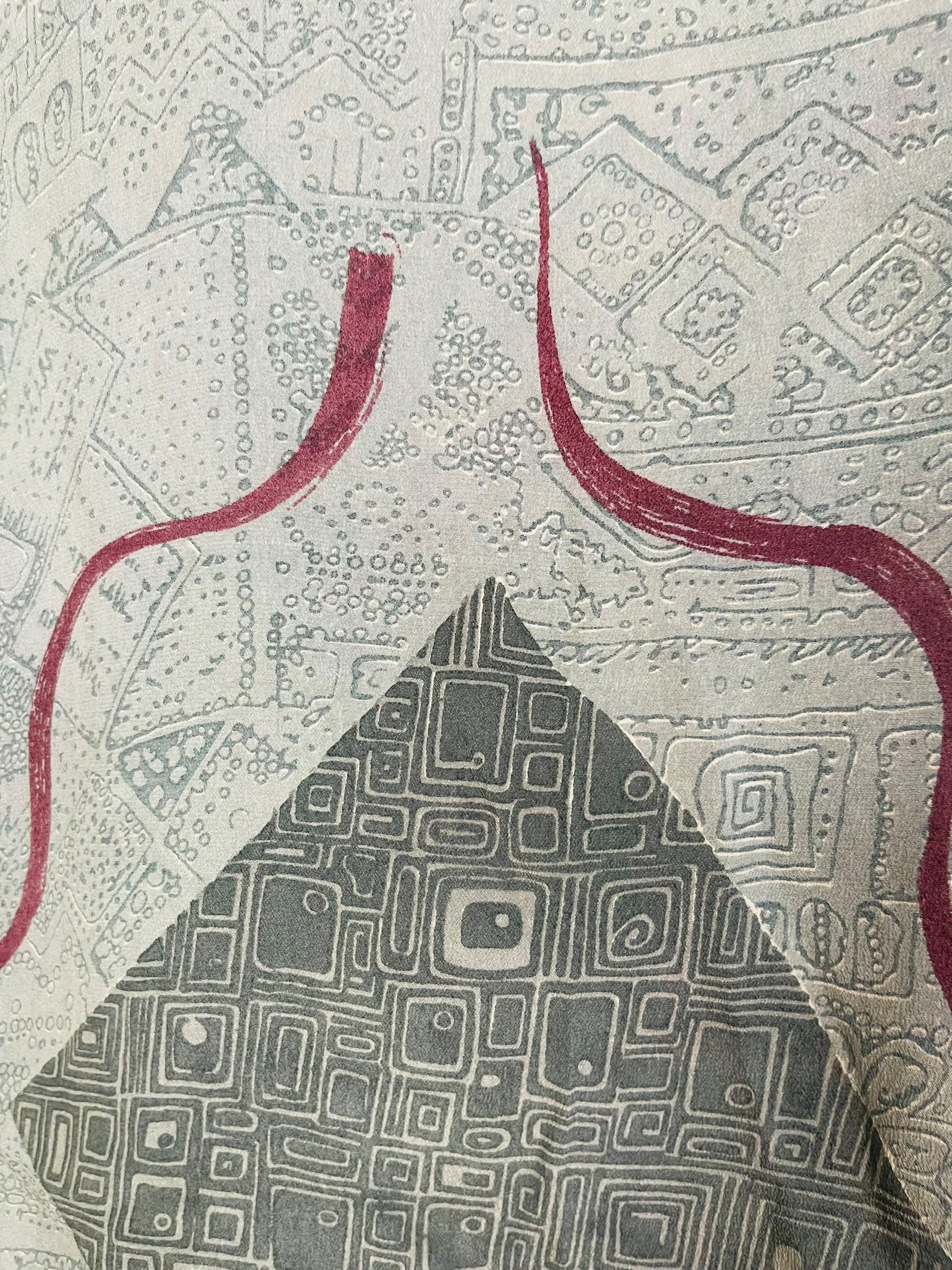 If you look very closely, you will see that the silks in this collection show some of the character of their previous incarnations through the appliqués that have been lovingly applied to bring new life to the fabric. This piece is a reminder that we are part of a collective journey to which we all add a little something.