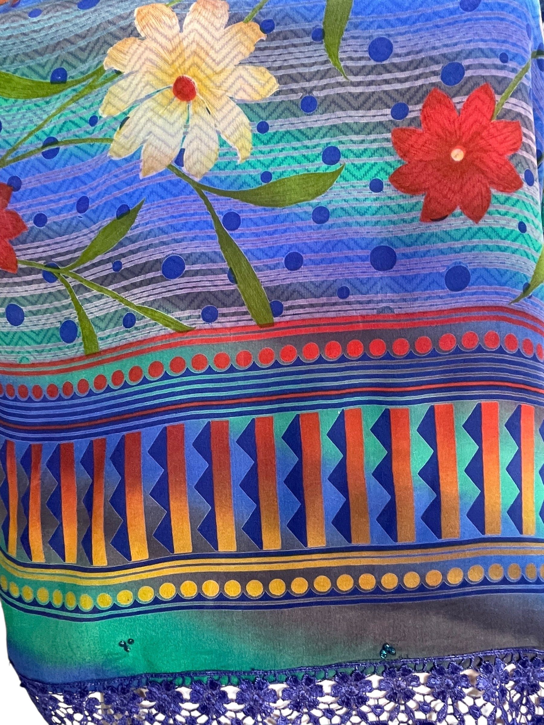In Eastern philosophy, an Avatar is an incarnation that teaches how to evolve virtues of the past into the present. The Pure Upcycled Silk Avatar Collection is made from vintage pure silk saris, chosen and worn by women in the past to celebrate their lives.If you look very closely, you will see that the silks in this collection show some of the character of their previous incarnations through the appliqués that have been lovingly applied to bring new life to the fabric. This piece is a reminder that we are part of a collective journey to which we all add a little something.