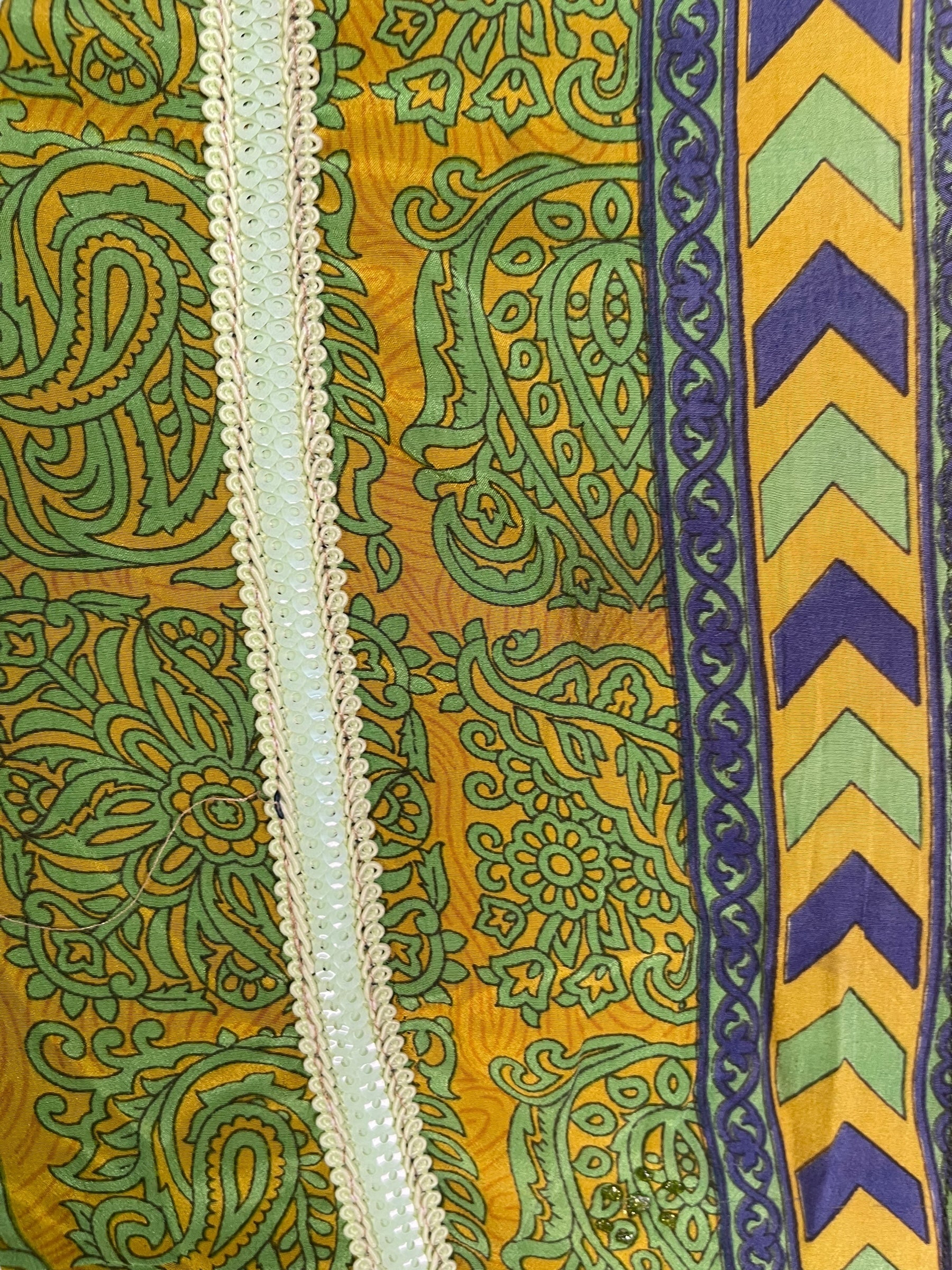 In Eastern philosophy, an Avatar is an incarnation that teaches how to evolve virtues of the past into the present. The Pure Upcycled Silk Avatar Collection is made from vintage pure silk saris, chosen and worn by women in the past to celebrate their lives.If you look very closely, you will see that the silks in this collection show some of the character of their previous incarnations through the appliqués that have been lovingly applied to bring new life to the fabric. This piece is a reminder that we are part of a collective journey to which we all add a little something.