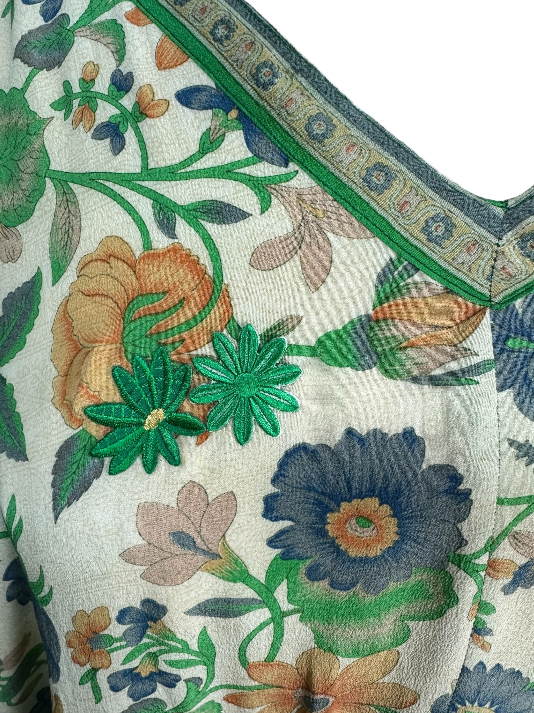 In Eastern philosophy, an Avatar is an incarnation that teaches how to evolve virtues of the past into the present. The Pure Upcycled Silk Avatar Collection is made from vintage pure silk saris, chosen and worn by women in the past to celebrate their lives.If you look very closely, you will see that the silks in this collection show some of the character of their previous incarnations through the appliqués that have been lovingly applied to bring new life to the fabric. This piece is a reminder that we are part of a collective journey to which we all add a little something.