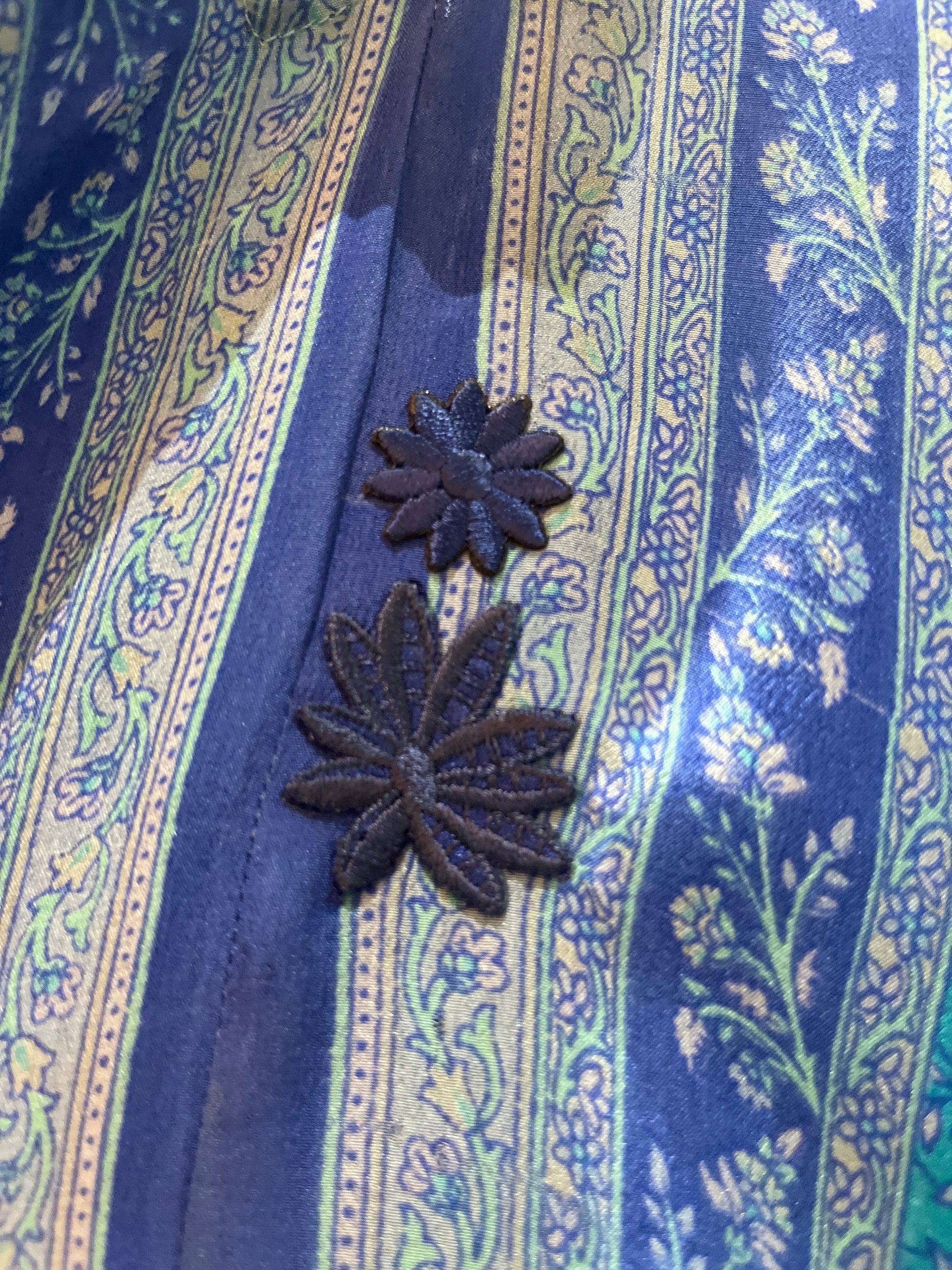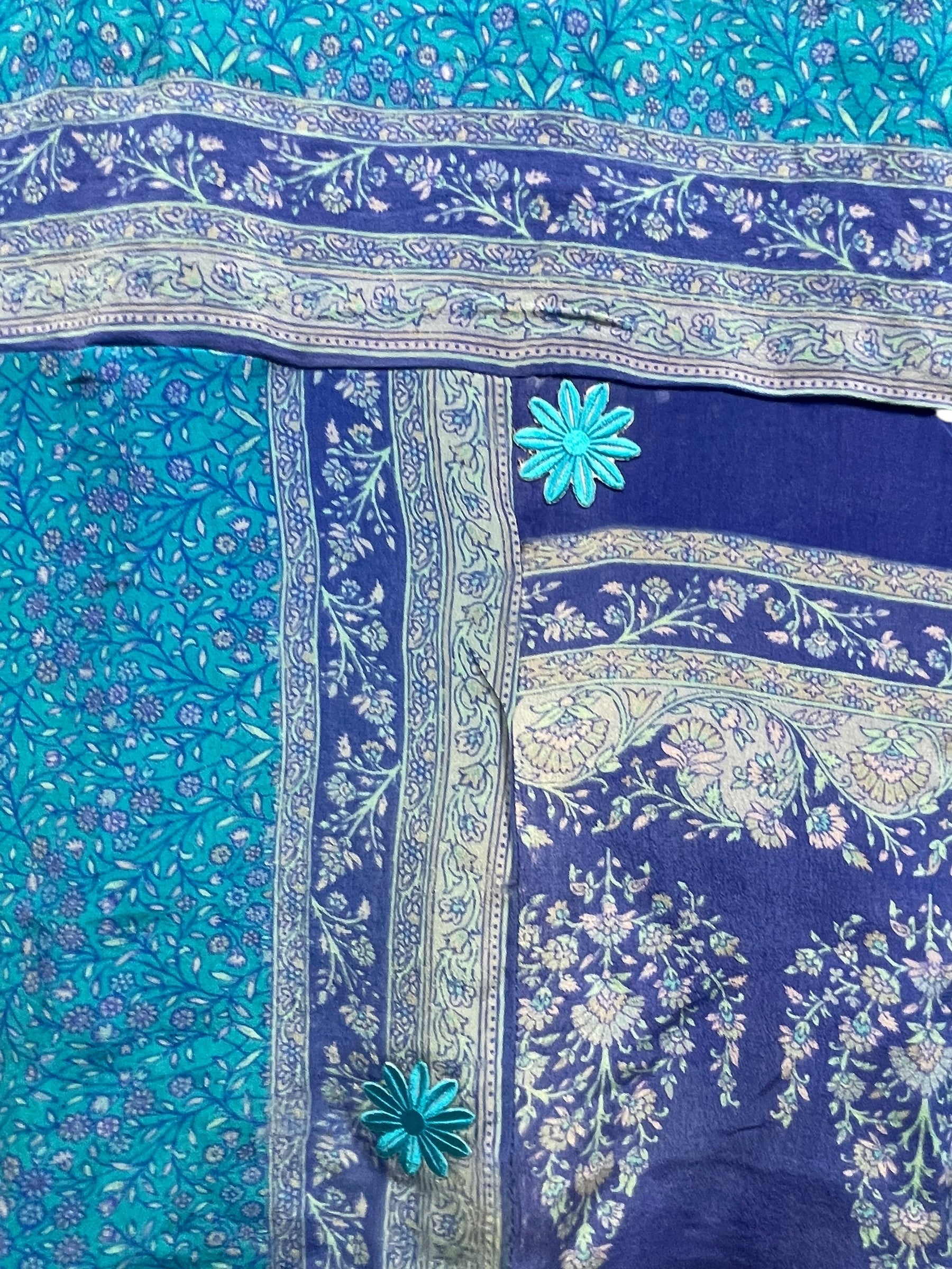 In Eastern philosophy, an Avatar is an incarnation that teaches how to evolve virtues of the past into the present. The Pure Upcycled Silk Avatar Collection is made from vintage pure silk saris, chosen and worn by women in the past to celebrate their lives.If you look very closely, you will see that the silks in this collection show some of the character of their previous incarnations through the appliqués that have been lovingly applied to bring new life to the fabric. This piece is a reminder that we are part of a collective journey to which we all add a little something.