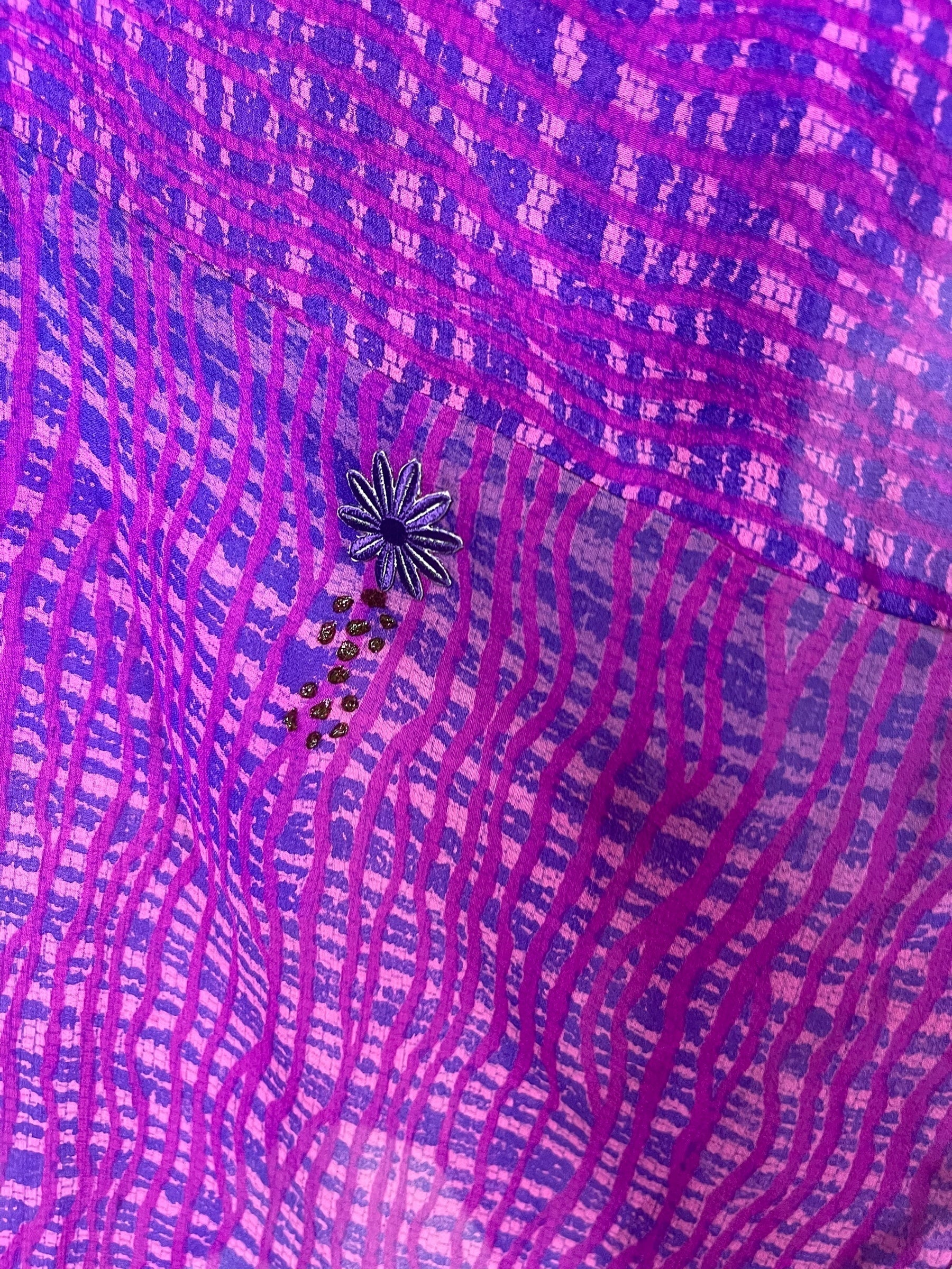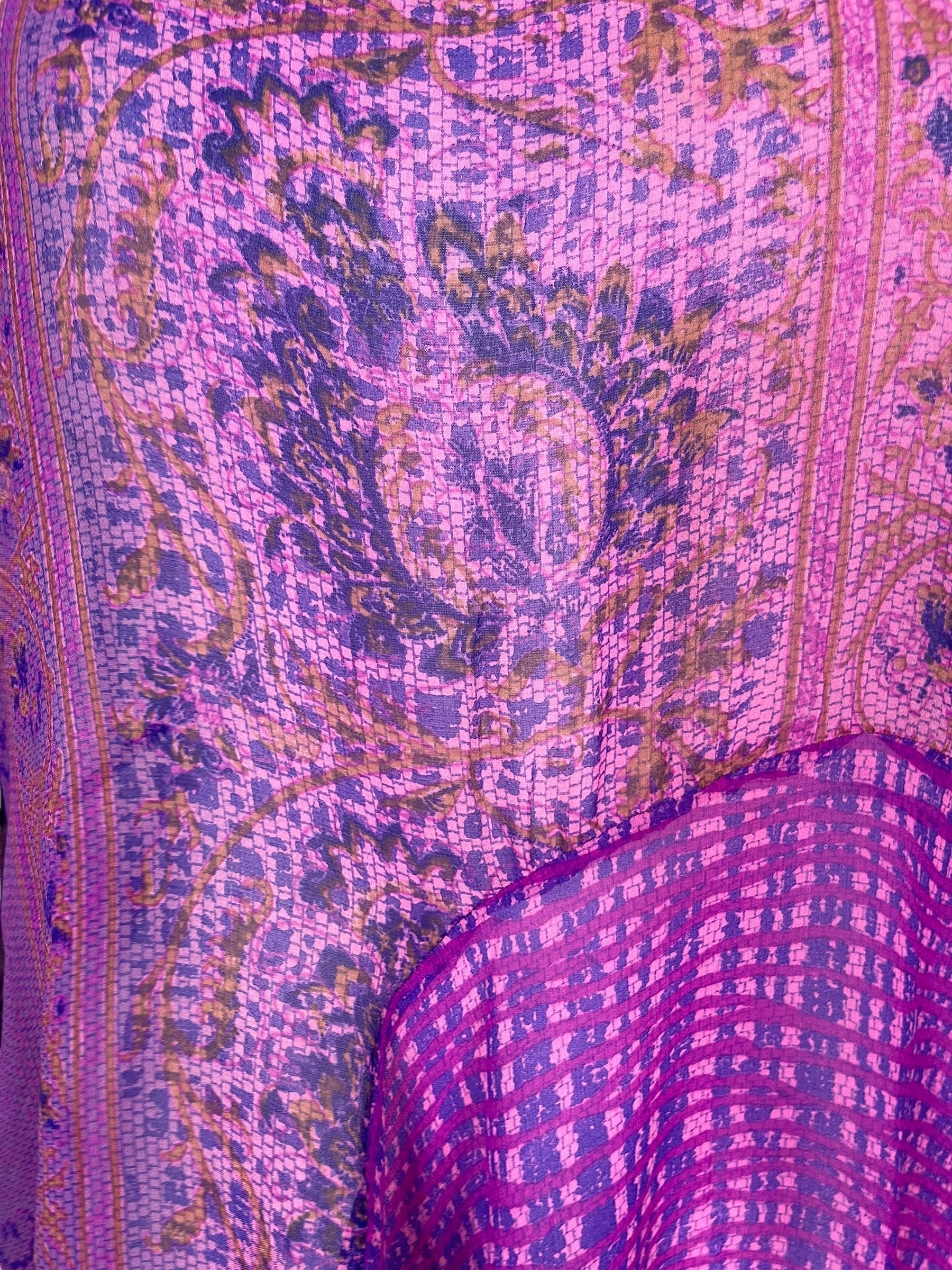In Eastern philosophy, an Avatar is an incarnation that teaches how to evolve virtues of the past into the present. The Pure Upcycled Silk Avatar Collection is made from vintage pure silk saris, chosen and worn by women in the past to celebrate their lives.If you look very closely, you will see that the silks in this collection show some of the character of their previous incarnations through the appliqués that have been lovingly applied to bring new life to the fabric. This piece is a reminder that we are part of a collective journey to which we all add a little something.