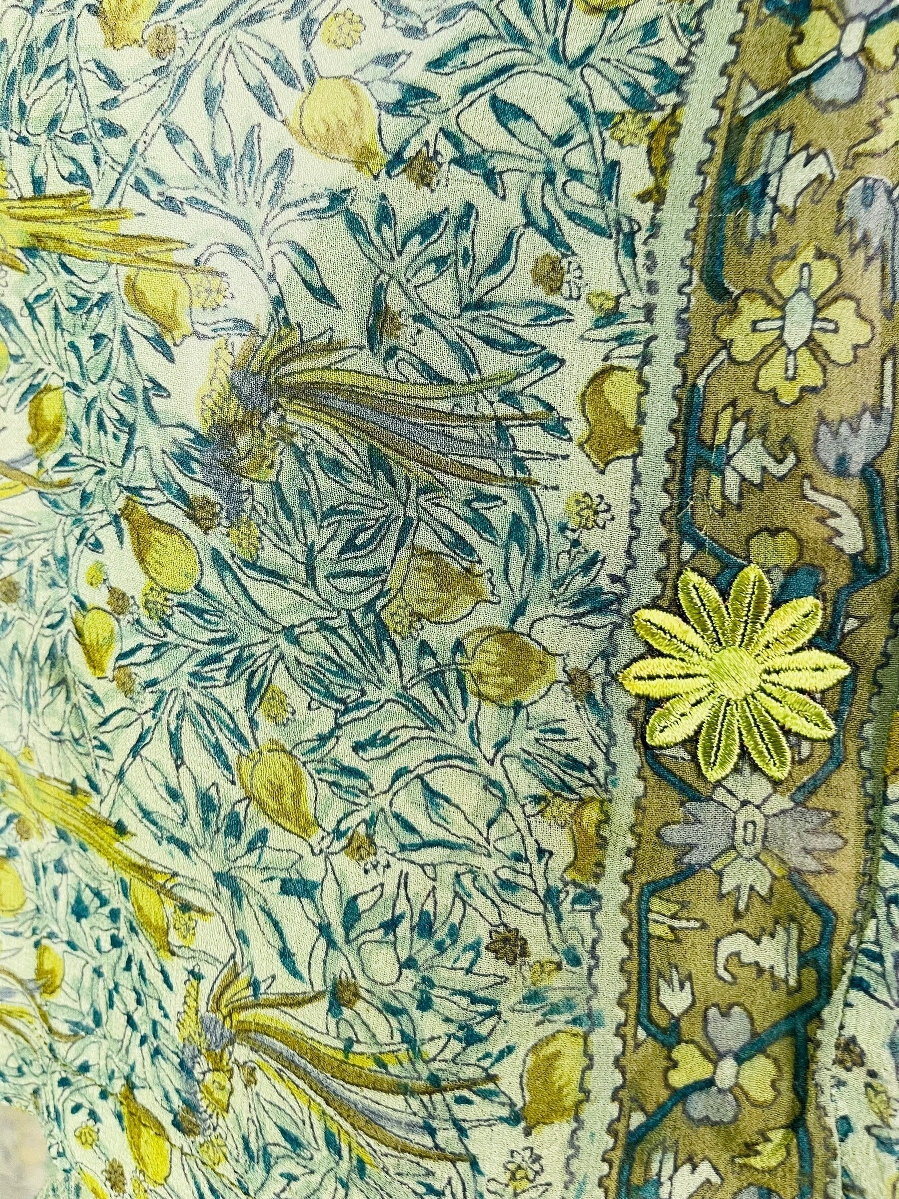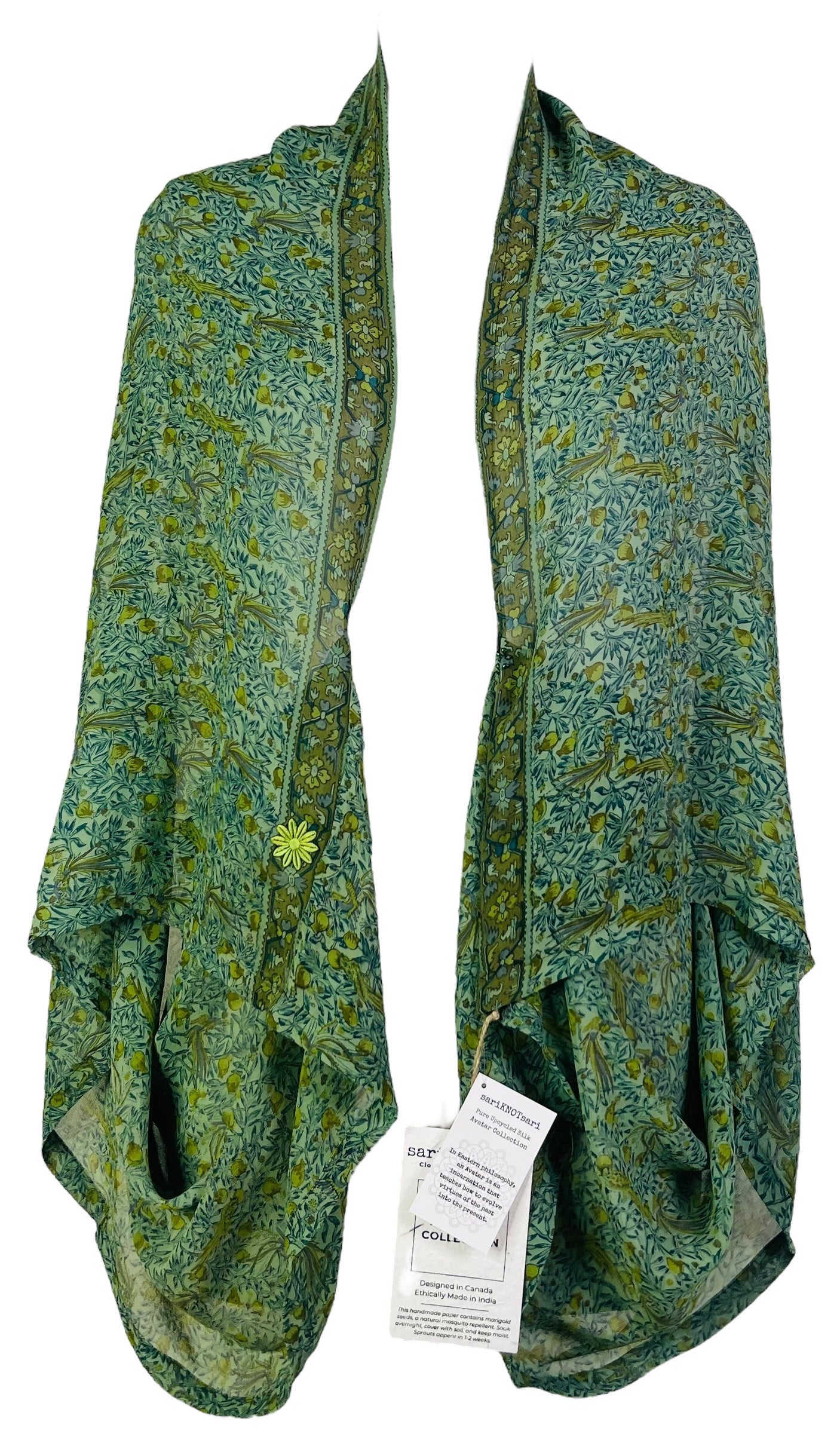 In Eastern philosophy, an Avatar is an incarnation that teaches how to evolve virtues of the past into the present. The Pure Upcycled Silk Avatar Collection is made from vintage pure silk saris, chosen and worn by women in the past to celebrate their lives.If you look very closely, you will see that the silks in this collection show some of the character of their previous incarnations through the appliqués that have been lovingly applied to bring new life to the fabric. This piece is a reminder that we are part of a collective journey to which we all add a little something.
