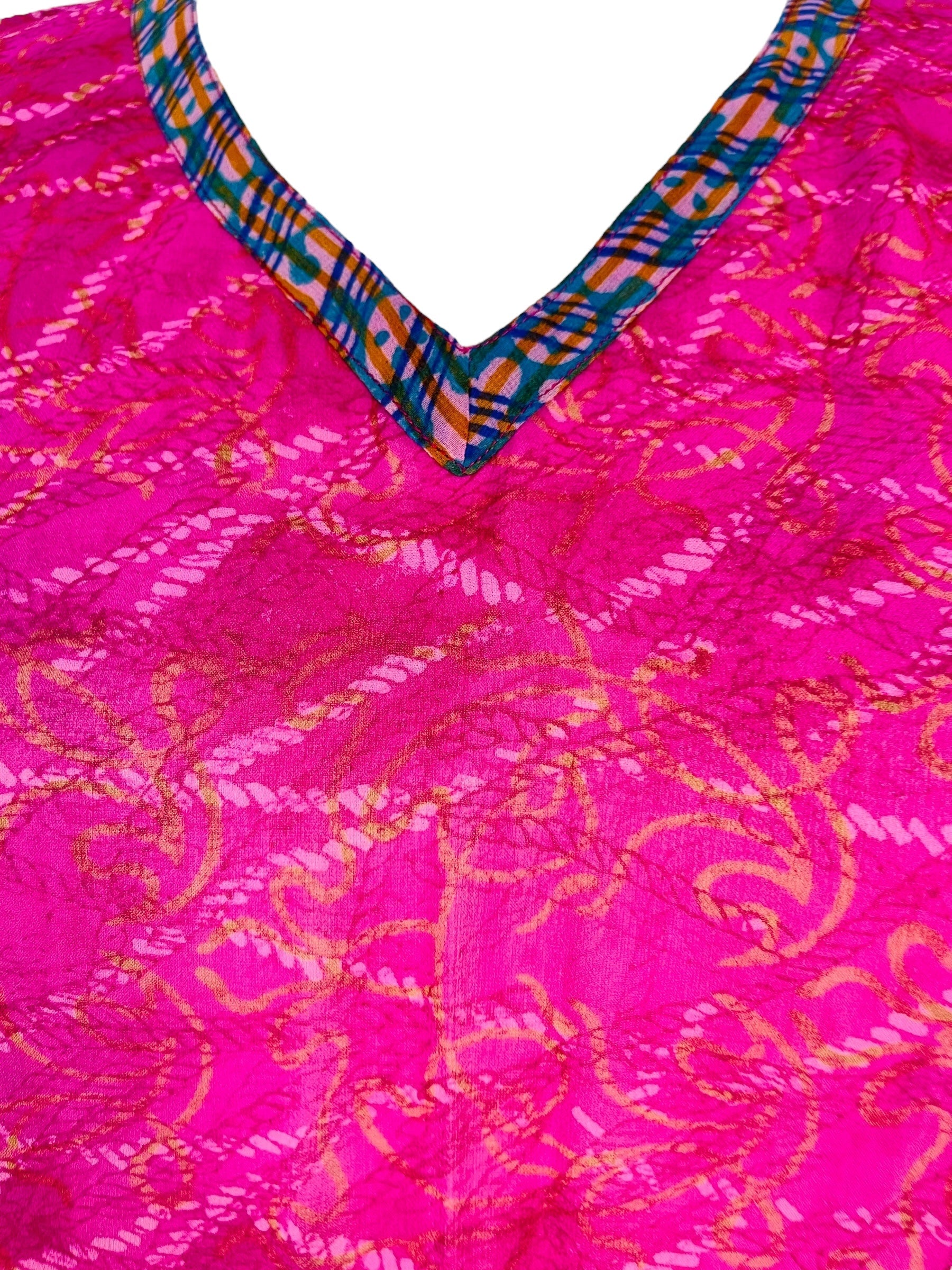 This midi-length kaftan brings style and sophistication to any occasion, from weddings to a beach day. Crafted from luxurious upcycled silk saris, the fabric has a beautiful flowing shape that flatters all body types. This kaftan dress can be worn as a single piece, or styled with pants for a fresh look. It's a one-size-fits-most item, so be sure to check the sizing chart for detailed measurements.